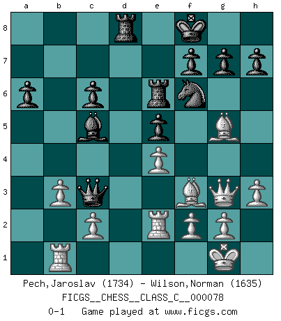Last move : 0-1 2008 September 7 20:51:59 [Event "FICGS__CHESS__CLASS_C__000078"] [Site "FICGS"] [Date "2008.04.18"] [Round "1"] [White "Pech,Jaroslav"] [Black "Wilson,Norman"] [Result "0-1"] [WhiteElo "1734"] [BlackElo "1635"] 1.e4 c5 2.Nf3 Nc6 3.d4 cxd4 4.Nxd4 e6 5.Nc3 Qc7 6.Be2 a6 7.O-O Nf6 8.Be3 Bb4 9.Nxc6 dxc6 10.Qd3 O-O 11.Rad1 b5 12.Bd4 e5 13.Qg3 Re8 14.Bf3 Bf8 15.Be3 Be6 16.Ne2 Qa5 17.Bg5 Be7 18.Bd2 b4 19.a3 Bc4 20.axb4 Bxb4 21.Bh6 Bf8 22.Rfe1 Rad8 23.Ra1 Qb4 24.Bg5 Re6 25.b3 Bxe2 26.Rxe2 Qc3 27.Rb1 Bc5 28.h3 Kf8 0-1 This chess game has been lost on time (started : 2008.04.18 0:31:11) Sicilian defense Kingside Castling by player White (move 7) Kingside Castling by player Black (move 10) Player Black won this chess game. Follow this game move after move (download)Do you realize Fischer almost never has any bad pieces? He exchanges them, and the bad pieces remain with his opponents. (Yuri Balashov) Ich habe die besten Aussichten, den ersten Preis zu gewinnen - denn jeder muss gegen Steinitz spielen, nur ich nicht! (Wilhelm Steinitz) Bendita sea la memoria de aquel que dio al mundo este juego inmortal. (A. G. Gardiner) Même un GMI sait rarement calculer sur plus de cinq coups une attaque à sacrifices. (Rudolf Spielmann) Beep ! (R2D2 in Star Wars ep.3)