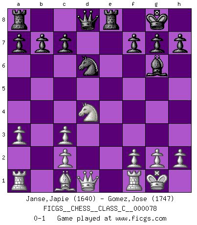 Last move : 0-1 2008 August 13 2:9:40 [Event "FICGS__CHESS__CLASS_C__000078"] [Site "FICGS"] [Date "2008.04.18"] [Round "1"] [White "Janse,Japie"] [Black "Gomez,Jose"] [Result "0-1"] [WhiteElo "1640"] [BlackElo "1747"] 1.e4 e5 2.Nf3 Nf6 3.d4 exd4 4.e5 Ne4 5.Qxd4 d5 6.exd6 Nxd6 7.Be2 Nc6 8.Qe3+ Be7 9.O-O O-O 10.Bd3 Nb4 11.a3 Nxd3 12.Qxd3 Bf5 13.Qd1 Bf6 14.Nc3 Bxc3 15.bxc3 Re8 16.Nd4 Bg6 0-1 Petrov : Modern attack, Main line Kingside Castling by player White (move 9) Kingside Castling by player Black (move 9) Player Black won this chess game. Follow this game move after move (download)In order to improve your game, you must study the endgame before everything else, for whereas the endings can be studied and mastered by themselves, the middle game and the opening must be studied in relation to the endgame. (Jose Raul Capablanca) Sicherlich können nur Meister einen Stil haben. Daß ein nicht-Meister auch nur ein einziges Mal in seinem Leben eine Partie folgerecht durchführte, habe ich niemals bemerkt. (Emanuel Lasker) Los problemas de Ajedrez exigen del compositor las mismas virtudes que caracterizan todo el arte de valor: originalidad, invención, concisión, armonía, complejidad e insinceridad explendida. (Vladimir Nabokov) Mais l'homme est une créature légère et illogique : semblable au joueur d'échecs, il n'aime que le processus du but à atteindre, non le but lui-même. (Dostoïevsky) Men never do evil so completely and cheerfully as when they do it from religious conviction. (Blaise Pascal)