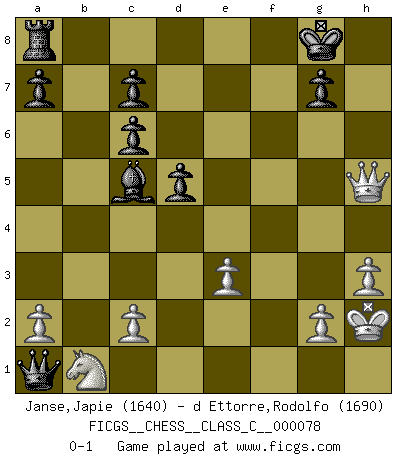 Last move : 0-1 2008 May 1 10:41:8 [Event "FICGS__CHESS__CLASS_C__000078"] [Site "FICGS"] [Date "2008.04.18"] [Round "1"] [White "Janse,Japie"] [Black "d Ettorre,Rodolfo"] [Result "0-1"] [WhiteElo "1640"] [BlackElo "1690"] 1.e4 e5 2.Nf3 Nc6 3.d4 exd4 4.Nxd4 Nf6 5.Nxc6 bxc6 6.Bd3 d5 7.e5 Ng4 8.O-O Bc5 9.Bf4 f6 10.exf6 O-O 11.h3 Qxf6 12.Be3 Nxe3 13.fxe3 Qxb2 14.Bxh7+ Kxh7 15.Qd3+ Bf5 16.Rxf5 Rxf5 17.Qxf5+ Kh8 18.Qh5+ Kg8 19.Kh2 Qxa1 0-1 Scotch : Schmidt variation Kingside Castling by player White (move 8) Kingside Castling by player Black (move 10) Player Black won this chess game. Follow this game move after move (download)There are two types of sacrifices: correct ones and mine. (Mikhail Tal) Schach verlangt totale Konzentration. (Robert James Fischer) Siempre es mejor sacrificar los hombres de tu oponente. (Savielly Tartakower) La vérité est comme le meilleur coup aux échecs : elle existe, mais il faut la chercher. (Arturo Perez-Reverte) If everyone is thinking alike, then somebody isn't thinking. (US General George S. Patton)
