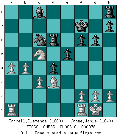 Last move : 0-1 2008 May 6 1:30:56 [Event "FICGS__CHESS__CLASS_C__000078"] [Site "FICGS"] [Date "2008.04.18"] [Round "1"] [White "Farrell,Clemence"] [Black "Janse,Japie"] [Result "0-1"] [WhiteElo "1600"] [BlackElo "1640"] 1.e4 c5 2.Nf3 Nc6 3.d4 cxd4 4.Nxd4 e6 5.Nc3 a6 6.Nxc6 bxc6 7.Bd3 d5 8.O-O Bc5 9.exd5 cxd5 10.Qg4 g6 11.Bg5 Be7 12.Qd4 f6 13.Be3 Bb7 14.Qb6 Qxb6 15.Bxb6 Bd8 16.Na4 Ne7 17.Bxd8 Rxd8 18.Nc5 Bc8 19.Nxa6 Kf7 20.b4 e5 21.a4 Rd6 22.Nc5 Nc6 23.c3 d4 0-1 Sicilian defense Kingside Castling by player White (move 8) Player Black won this chess game. Follow this game move after move (download)Pawns are born free, yet they are everywhere in chains. (Rick Kennedy) Obwohl ich vom Stil her kaum zu den Priestern der Schachkunst gezählt werde, halte ich Schach doch für eine Kunst. (Tigran Petrosjan) Durante una competencia de Ajedrez, un Maestro de Ajedrez deberá ser una combinación de presa de caza y un Monge. (Alexander Alekhine) J'ai vu le vaincu d'Echecs jouer des années durant dans l'espoir de la fête de la victoire. Car tu es plus riche de ce qu'elle existe si même elle n'est point pour toi. Ainsi de la perle du fond des mers. (Antoine de Saint-Exupéry) Creativity is inventing, experimenting, growing, taking risks, breaking rules, making mistakes, and having fun. (Mary Lou Cook)