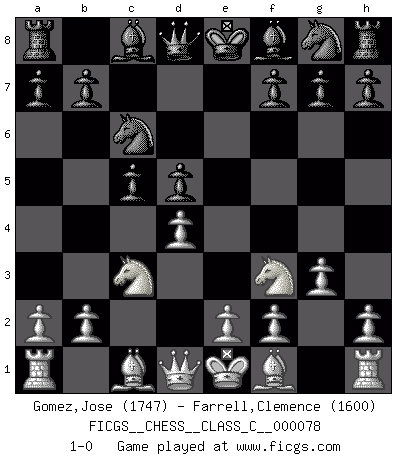 Last move : 1-0 2008 June 17 0:34:3 [Event "FICGS__CHESS__CLASS_C__000078"] [Site "FICGS"] [Date "2008.04.18"] [Round "1"] [White "Gomez,Jose"] [Black "Farrell,Clemence"] [Result "1-0"] [WhiteElo "1747"] [BlackElo "1600"] 1.d4 d5 2.c4 e6 3.Nc3 c5 4.cxd5 exd5 5.Nf3 Nc6 6.g3 1-0 This chess game has been lost on time (started : 2008.04.18 0:31:11) QGD : Tarrasch, Schlechter-Rubinstein system Player White won this chess game. Follow this game move after move (download)The isolated Pawn casts gloom over the entire chessboard. (Aaron Nimzovich) Ich verstehe Aljechins Kombinationen ganz gut; aber woher er diese Angriffschancen bekommt und wie er die Eröffnung behandelt das ist für mich ein Buch mit sieben Siegeln. (Rudolf Spielmann) El ganar no lo es todo... pero el perder es nada. (Mednis) Il n'y a pas eu de défaite parce que je ne crois pas que cet ordinateur ait jamais existé. IBM a triché en refusant d'imprimer les modes de recherche de la machine. C'est évident, pendant le match, des coups décisifs ont été joués par des êtres humains. Aujourd'hui, les meilleurs spécialistes en informatique ne peuvent toujours pas expliquer comment Deep-Blue a pu jouer contre la logique des ordinateurs. IBM a gagné une guerre de communication, mais ils sont incapables de prouver que l'ordinateur a gagné tout seul. (Garry Kasparov) The Movers & Shakers of this world are those who play chess in the mornings and go to the disco in the evenings. (Dinesh De Silva)