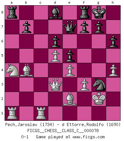Last move : 0-1 2008 October 1 10:37:30 [Event "FICGS__CHESS__CLASS_C__000078"] [Site "FICGS"] [Date "2008.04.18"] [Round "1"] [White "Pech,Jaroslav"] [Black "d Ettorre,Rodolfo"] [Result "0-1"] [WhiteElo "1734"] [BlackElo "1690"] 1.d4 Nf6 2.c4 d6 3.Nc3 Bf5 4.Nf3 c6 5.Nh4 Bd7 6.e4 e5 7.Nf3 Bg4 8.Be2 Nbd7 9.O-O Be7 10.Be3 O-O 11.d5 cxd5 12.cxd5 Bxf3 13.Bxf3 a5 14.a3 Rc8 15.Rc1 h6 16.g3 Ne8 17.h4 Nef6 18.Kg2 Nc5 19.b4 axb4 20.axb4 Na6 21.Qb3 Qd7 22.Be2 Bd8 23.f3 Nh5 24.Bd2 Qe7 25.Na4 Ra8 26.Ra1 Nb8 27.Qd3 Na6 28.Rfc1 Nxb4 29.Bxb4 Nxg3 0-1 This chess game has been lost on time (started : 2008.04.18 0:31:11) Old Indian : Janowski variation Kingside Castling by player White (move 9) Kingside Castling by player Black (move 10) Player Black won this chess game. Follow this game move after move (download)Different people feel differently about resigning. (Bobby Fischer) Als er Schachweltmeister wurde ließ er praktisch alle stärksten Sovietspieler für sich arbeiten. Wenn ein auch nur mittelmässiger Meister ein Spezialist für eine bestimmte Eröffnung war, wurde er von Karpov gerufen. Das wurde alles geheim gehalten. (Mikhail Moiseyevich Botvinik) El Ajedrez es un cuento de Hadas de las 1001 metidas de pata. (Savielly Tartakower) Des idées, des idées, j'en ai cent, j'en ai mille. Des bonnes, des mauvaises, applicables, irréalisables... Il suffit de faire le tri ! (Roos) All war is based on deception. (Sun Tzu)