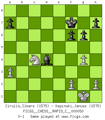 Last move : 0-1 2008 August 10 18:2:57 [Event "FICGS__CHESS__RAPID_C__000050"] [Site "FICGS"] [Date "2008.04.19"] [Round "1"] [White "Cirulis,Ilmars"] [Black "Kepinski,Janusz"] [Result "0-1"] [WhiteElo "1575"] [BlackElo "1575"] 1.d4 Nf6 2.c4 e6 3.a3 d5 4.e3 c5 5.Nf3 Nc6 6.Nc3 Be7 7.cxd5 Nxd5 8.Bc4 Nb6 9.Ba2 cxd4 10.exd4 O-O 11.O-O Qd7 12.Be3 Nd5 13.Nxd5 exd5 14.Rc1 Rd8 15.Re1 Qe8 16.Qb3 Be6 17.Qxb7 Na5 18.Qa6 Nc4 19.Bxc4 dxc4 20.Bg5 Rd6 21.Qa5 f6 22.Bf4 Rc6 23.Rc2 Qd8 24.Bc7 Qc8 25.Rce2 Qxc7 26.Qxc7 Rxc7 27.Rxe6 Kf7 28.d5 Rd8 29.Rc6 Rxc6 30.dxc6 Rd6 31.Nd4 Bd8 32.Nf5 Rxc6 33.Rd1 Bc7 34.g4 g6 35.Ne3 Be5 36.Rc1 Bxb2 37.Rxc4 Rxc4 38.Nxc4 Bd4 0-1 Queen's pawn game Kingside Castling by player Black (move 10) Kingside Castling by player White (move 11) Player Black won this chess game. Follow this game move after move (download)Even the laziest King flees wildly in the face of a double check ! (Aaron Nimzowitsch) Im Hotelzimmer gab es nur zwei Schaben. (Über die Turnierbedingungen) (Peter Swidler) El poder defensivo de una pieza clavada, solamente es imaginario. (Aaron Nimzovich) Les sacrifices démontrent seulement que quelqu'un a gaffé. (Savielly Tartacover) There's no money in correspondence chess. (John Knudsen)
