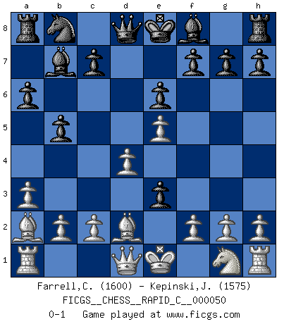 Last move : 0-1 2008 April 29 1:35:4 [Event "FICGS__CHESS__RAPID_C__000050"] [Site "FICGS"] [Date "2008.04.19"] [Round "1"] [White "Farrell,Clemence"] [Black "Kepinski,Janusz"] [Result "0-1"] [WhiteElo "1600"] [BlackElo "1575"] 1.e4 e6 2.d4 d5 3.Nd2 Nf6 4.e5 Ne4 5.Nxe4 dxe4 6.Bc4 a6 7.a3 b5 8.Ba2 Bb7 9.Bd2 e3 0-1 French : Tarrasch, Closed variation Player Black won this chess game. Follow this game move after move (download)Help your pieces so they can help you. (Paul Morphy) Im Blitz ist es einfacher mit einer Figur weniger anzugreifen, als sich mit einer Mehrfigur zu verteidigen. (Mikhail Nekhemyevich Tal) Mi estilo es algo parecido entre un poco de Tal y Petrosian. (Reshevsky) Demandez au pauvre Cg1 ce qu'il en pense. Eduard Gufeld à propos de la variante Saemisch de l'Est-Indienne. Thibault, I ask for draw. Game 13876. - Sorry Ilmars, you won. (FICGS chat)