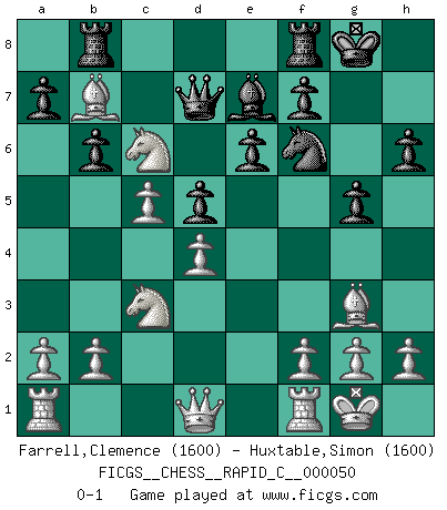 Last move : 0-1 2008 June 16 12:31:59 [Event "FICGS__CHESS__RAPID_C__000050"] [Site "FICGS"] [Date "2008.04.19"] [Round "1"] [White "Farrell,Clemence"] [Black "Huxtable,Simon"] [Result "0-1"] [WhiteElo "1600"] [BlackElo "1600"] 1.e4 c6 2.d4 d5 3.exd5 cxd5 4.c4 Nc6 5.Nc3 Nf6 6.Bg5 e6 7.Nf3 Be7 8.c5 O-O 9.Bb5 b6 10.Bxc6 Rb8 11.O-O h6 12.Bh4 g5 13.Bg3 Bb7 14.Ne5 Ra8 15.Bxb7 Rb8 16.Nc6 Qd7 0-1 This chess game has been lost on time (started : 2008.04.19 12:27:57) Caro-Kann : Panov-Botvinnik attack Kingside Castling by player Black (move 8) Kingside Castling by player White (move 11) Player Black won this chess game. Follow this game move after move (download)If your opponent cannot do anything active, then don't rush the position; instead you should let him sit there, suffer, and beg you for a draw. (Jeremy Silman) Meine Liebe ist Schach, Schach, Schach. Ich muss jeden Tag Schach spielen, deshalb fühle ich mich so stark. (Miguel Najdorf) Haz el enroque temprano y seguido. (Rob Sillars) L'attaque fait le spectacle, la défense gagne les matchs. (Dicton footballistique) Gambling is the son of avarice and the father of despair. (French proverb)