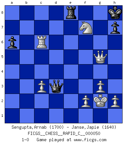 Last move : 1-0 2008 April 30 10:54:36 [Event "FICGS__CHESS__RAPID_C__000050"] [Site "FICGS"] [Date "2008.04.19"] [Round "1"] [White "Sengupta,Arnab"] [Black "Janse,Japie"] [Result "1-0"] [WhiteElo "1700"] [BlackElo "1640"] 1.e4 c5 2.Nf3 Nc6 3.Bb5 a6 4.Bxc6 bxc6 5.O-O e6 6.d3 d5 7.Nc3 d4 8.Na4 Nf6 9.c3 Be7 10.Qc2 Bb7 11.Qb3 Rb8 12.Bf4 Bd6 13.Bxd6 Qxd6 14.e5 Qe7 15.exf6 gxf6 16.Qc4 O-O 17.Nxc5 Bc8 18.Nxd4 Rxb2 19.Rfb1 Rxb1+ 20.Rxb1 e5 21.Nxc6 Qc7 22.Qd5 Kh8 23.a4 Rg8 24.a5 e4 25.Nxe4 Bb7 26.Rb6 Re8 27.Qd4 Bxc6 28.Qxf6+ Kg8 29.Rxc6 Qxa5 30.g3 Qa1+ 31.Kg2 Qd1 32.Qg5+ Kh8 33.Nd6 Qxd3 34.Nxf7+ 1-0 Sicilian : Nimzovich-Rossolimo attack (without ...d6) Kingside Castling by player White (move 5) Kingside Castling by player Black (move 16) Player White won this chess game. Follow this game move after move (download)When I have White, I win because I am white; When I have Black, I win because I am Bogolyubov. (Bogolyubov) Schach ist Kampf, hauptsächlich jedoch gegen die eigenen Fehler. (Savielly Grigorievitsch Tartakower) Sin errores no puede haber brillantez. (Emanuel Lasker) 'L'échange des dames est un coup dur pour les deux adversaires...' Un journaliste lors d'une partie du match Spassky-Fischer If passion drives you, let reason holds the reins. (Benjamin Franklin)