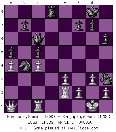 Last move : 0-1 2008 May 8 14:27:23 [Event "FICGS__CHESS__RAPID_C__000050"] [Site "FICGS"] [Date "2008.04.19"] [Round "1"] [White "Huxtable,Simon"] [Black "Sengupta,Arnab"] [Result "0-1"] [WhiteElo "1600"] [BlackElo "1700"] 1.d4 d5 2.Nf3 Nc6 3.Bf4 Bg4 4.e3 e6 5.Bb5 Bd6 6.Bxd6 Qxd6 7.Nbd2 Nf6 8.Bd3 e5 9.dxe5 Nxe5 10.O-O O-O 11.b3 Rfe8 12.Re1 a5 13.a4 h6 14.Be2 Nc6 15.c4 Rad8 16.Ra2 Nb4 17.Rb2 c5 18.g3 Qc6 19.Bf1 dxc4 20.bxc4 Rxd2 21.Rxd2 Bxf3 22.Qa1 Ne4 23.Rb2 Rd8 24.Be2 Ng5 25.Rc1 Bxe2 26.Rxe2 Nh3+ 0-1 Queen's pawn game, Chigorin variation Kingside Castling by player White (move 10) Kingside Castling by player Black (move 10) Player Black won this chess game. Follow this game move after move (download)I thought the most common mistake [in chess] was the first one: Learning the game :P (Garvin Gray, FICGS forum) Es tut gut, die Entwicklungsperiode von, [...] demokratischem Geist durchdringen zu lassen. Wie undemokratisch wäre es doch beispielsweise, den einen Offizier große Spaziertouren vornehmen zu lassen, während die anderen zu Hause säßen und sich entsetzlich langweilten. (Aaron Nimzowitsch) La estratégia requiere pensar, la táctica requiere observación. (Max Euwe) J'ai toujours senti une vague pitié pour l'homme qui ne connaît rien aux échecs, tout comme j'en aurais pour un homme ignorant de l'amour. Les Echecs, comme la musique ou comme l'amour, ont le pouvoir de rendre heureux. (Siegbert Tarrasch) Cactus - It is depressed cucumber. (Ilmars Cirulis)