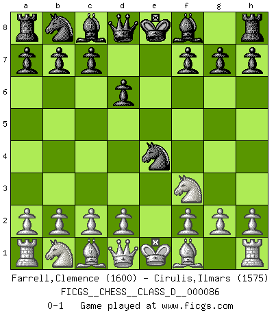 Last move : 0-1 2008 May 6 1:31:10 [Event "FICGS__CHESS__CLASS_D__000086"] [Site "FICGS"] [Date "2008.04.20"] [Round "1"] [White "Farrell,Clemence"] [Black "Cirulis,Ilmars"] [Result "0-1"] [WhiteElo "1600"] [BlackElo "1575"] 1.e4 e5 2.Nf3 Nf6 3.Nxe5 d6 4.Nf3 Nxe4 0-1 Petrov's defense Player Black won this chess game. Follow this game move after move (download)Bobby just drops the pieces and they fall on the right squares. (Miguel Najdorf) Die FIDE ist dabei in die Hände der russischen Mafia zu fallen. (Larry Evans) No existe un remordimiento como el remordimiento del Ajedrez. (H. G. Wells) Les Echecs, c'est l'art de la guerre sans les charniers, c'est la résurrection des morts tombés au champ d'honneur, l'espoir perpétuel, la suprématie de l'intelligence sur la force, la culture de l'esprit. (F. Szpiner) When the going gets tactical, the computers get going. (Hyatt)