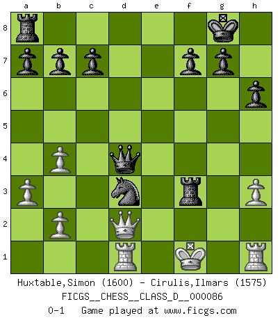 Last move : 0-1 2008 May 21 18:55:10 [Event "FICGS__CHESS__CLASS_D__000086"] [Site "FICGS"] [Date "2008.04.20"] [Round "1"] [White "Huxtable,Simon"] [Black "Cirulis,Ilmars"] [Result "0-1"] [WhiteElo "1600"] [BlackElo "1575"] 1.d4 Nf6 2.Nc3 d5 3.Bg5 h6 4.Bxf6 exf6 5.e4 dxe4 6.Nxe4 Bb4+ 7.c3 O-O 8.cxb4 Re8 9.f3 f5 10.Bd3 fxe4 11.fxe4 Qxd4 12.Qd2 Nc6 13.a3 Ne5 14.Ke2 Bg4+ 15.Nf3 Nxd3 16.h3 Rxe4+ 17.Kf1 Bxf3 18.gxf3 Re3 19.Rd1 Rxf3+ 0-1 Queen's pawn game Kingside Castling by player Black (move 7) Player Black won this chess game. Follow this game move after move (download)I had a toothache during the first game. In the second game I had a headache. In the third game it was an attack of rheumatism. In the fourth game, I wasn't feeling well. And in the fifth game? Well, must one have to win every game ? (Siegbert Tarrasch) Im Fernschach kannst du während dem Spiel rauchen. (John Christen Knudsen) La única cosa que los jugadores de Ajedrez tienen en común, es el Ajedrez. (Lodewijk Prins) Il n'y a plus de joueurs du niveau de Jacob Murray dont la seule quête est le beau jeu, le plaisir de voir les pièces construire quelque chose. Sur 10 idées à la minute, 9 seront sans intérêt, la dernière s'avèrera géniale. (Christian Bauer) A generalist learns less and less about more and more until he knows nothing about everything. (Author unknown)