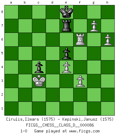 Last move : 1-0 2008 September 20 15:53:44 [Event "FICGS__CHESS__CLASS_D__000086"] [Site "FICGS"] [Date "2008.04.20"] [Round "1"] [White "Cirulis,Ilmars"] [Black "Kepinski,Janusz"] [Result "1-0"] [WhiteElo "1575"] [BlackElo "1575"] 1.d4 Nf6 2.c4 e6 3.a3 b6 4.Nc3 Bb7 5.Nf3 d5 6.e3 Be7 7.cxd5 exd5 8.Qa4+ Nbd7 9.Bd3 O-O 10.O-O a6 11.b4 c5 12.dxc5 bxc5 13.Bb2 Nb6 14.Qc2 cxb4 15.axb4 Bxb4 16.Ng5 g6 17.Rac1 Rc8 18.Qb3 a5 19.Na2 Nfd7 20.Nxh7 Kxh7 21.Nxb4 axb4 22.Qxb4 Nc4 23.Bxc4 dxc4 24.Qxb7 Rb8 25.Qa7 Rxb2 26.Rcd1 Qb6 27.Qxd7 Qe6 28.Qxe6 fxe6 29.Rc1 Rc8 30.Rc3 Kg7 31.h4 Rb3 32.Rfc1 Rxc3 33.Rxc3 e5 34.f3 Kf6 35.e4 Rc6 36.Kf2 Ke7 37.Ke3 Ke6 38.Kd2 Kf6 39.Ra3 Ke6 40.Kc3 Kf6 41.Ra7 Ke6 42.g4 Kf6 43.g5+ Ke6 44.Rg7 Rc8 45.Rxg6+ Kf7 46.h5 Rc7 47.Rf6+ Ke7 48.h6 Ke8 49.g6 Re7 50.g7 1-0 Queen's pawn game Kingside Castling by player Black (move 9) Kingside Castling by player White (move 10) 10 pieces endgame at move 45 : White KRPPPP , Black KRPP WHITE : King + 1 Rook 4 Pawns BLACK : King + 1 Rook 2 Pawns Player White won this chess game. Follow this game move after move (download)Later, I began to succeed in decisive games. Perhaps because I realized a very simple truth: not only was I worried, but also my opponent. (Mikhail Tal) Immer nach dem besten Zug zu suchen ist ziemlich unpraktisch. (Nigel Short) El Ajedrez, como cualquier actividad creativa, solo puede existir a través del esfuerzo combinado de aquellos que tienen talento creativo y de aquellos que poseen la habilidad de organizar su trabajo creativo. (Mikhail Botvinnik) La victoire dans une partie d'Echecs appartient la plupart du temps à celui qui voit un peu plus loin que l'adversaire. (Lasker) Wipe them out. All of them. (Darth Sidious in Star Wars ep.1)