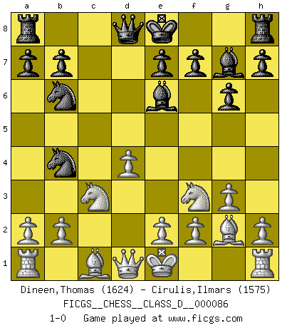 Last move : 1-0 2008 May 24 10:33:27 [Event "FICGS__CHESS__CLASS_D__000086"] [Site "FICGS"] [Date "2008.04.20"] [Round "1"] [White "Dineen,Thomas"] [Black "Cirulis,Ilmars"] [Result "1-0"] [WhiteElo "1624"] [BlackElo "1575"] 1.d4 Nf6 2.c4 d5 3.cxd5 g6 4.Qa4+ c6 5.dxc6 Nxc6 6.Nf3 Bg7 7.Nc3 Bf5 8.g3 Nd5 9.Bg2 Nb6 10.Qb3 Be6 11.Qc2 Nb4 12.Qd1 1-0 Queen's pawn game Player White won this chess game. Follow this game move after move (download)In life, as in Chess, one's own Pawns block one's way. A man's very wealth, ease, leisure, children, books, which should help him to win, more often checkmate him. (Charles Buxton) Der Partner hat auch seine Existenzberechtigung. (Savielly Grigorievitsch Tartakower) Los finales de Peón son del Ajedrez lo que el cesped es del Golf. (Cecil Purdy) Le jeu d'échecs fait naître et fortifie en nous plusieurs qualités précieuses dans le cours de l'existence, telles que la prévoyance, la circonspection, la prudence, et la persévérance. (Benjamin Franklin - 1783, la morale des échecs) Faith : not wanting to know what is true. (Friedrich Nietzsche)