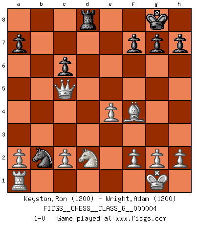 Last move : 1-0 2006 July 31 22:7:55 [Event "FICGS__CHESS__CLASS_G__000004"] [Site "FICGS"] [Date "2006.07.14"] [Round "1"] [White "Keyston,Ron"] [Black "Wright,Adam"] [Result "1-0"] [WhiteElo "1200"] [BlackElo "1200"] 1.e4 e5 2.Nf3 d6 3.d4 Nc6 4.Bb5 Bd7 5.Bxc6 bxc6 6.dxe5 Qe7 7.Qd4 Qxe5 8.Nxe5 dxe5 9.Qxe5+ Ne7 10.Qxc7 Ng6 11.O-O Bc5 12.Rd1 O-O 13.Qxd7 Ne5 14.Qf5 Rfe8 15.Bf4 Nc4 16.Qxc5 Nxb2 17.Rd4 Rec8 18.Rd7 Rd8 19.Rxd8+ Rxd8 20.Nd2 1-0 Philidor's defense Kingside Castling by player White (move 11) Kingside Castling by player Black (move 12) Player White won this chess game. Follow this game move after move (download)I'd rather have a Pawn than a finger. (Reuben Fine) Die Elozahlen sind sehr schlecht für das Schach. Jetzt ist Schach eine Sportindustrie, die darauf zielt Elopunkte zu machen. (Miguel Najdorf) En la perfecta combinación de Ajedrez como en una historia corta de primera clase, toda la trama y contra trama deberá conducir hacia un final sorprendente, el interes no es mitigado hasta el último momento. (Yates and Winter) J'apprécie les joueurs d'est-indienne, c'est grâce à eux que je nourris ma famille depuis tant d'années. (Petrosian) Hold em is to stud what chess is to checkers. (Johnny Moss)