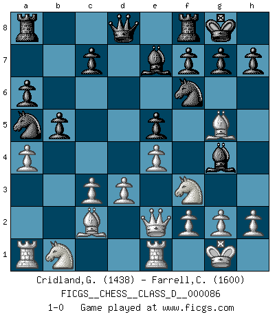Last move : 1-0 2008 May 6 1:31:42 [Event "FICGS__CHESS__CLASS_D__000086"] [Site "FICGS"] [Date "2008.04.20"] [Round "1"] [White "Cridland,Graham"] [Black "Farrell,Clemence"] [Result "1-0"] [WhiteElo "1438"] [BlackElo "1600"] 1.e4 e5 2.Nf3 Nc6 3.Bb5 a6 4.Ba4 Nf6 5.O-O Be7 6.Re1 b5 7.Bb3 d6 8.c3 O-O 9.a4 Bg4 10.d3 d5 11.Qe2 d4 12.Bg5 dxc3 13.bxc3 Na5 14.Bc2 1-0 Ruy Lopez : Closed Kingside Castling by player White (move 5) Kingside Castling by player Black (move 8) Player White won this chess game. Follow this game move after move (download)If your opponent offers you a draw, try to work out why he thinks he's worse off. (Nigel Short) Ich habe die Schachforschung dermaßen betrieben, dass sie auf eine wissenschaftliche Basis gestellt wurde. (Mikhail Moiseyevich Botvinik) Cuando me preguntan: -¿Cual es el secreto que te hace hacer mejores movidas que tus oponentes?, Yo respondo: Me da gusto que me pregunten eso, porque, como veran, hay una simple razón. Yo pienso mis propias movidas y dejo a mi oponente que el piense las suyas. (Alexander Alekhine) Aucun coup ne doit être joué sans but. (Pedro Damiano) A cynic is a man who knows the price of everything but the value of nothing. (Oscar Wilde)