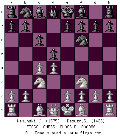 Last move : 1-0 2008 June 2 23:25:11 [Event "FICGS__CHESS__CLASS_D__000086"] [Site "FICGS"] [Date "2008.04.20"] [Round "1"] [White "Kepinski,Janusz"] [Black "Dsouza,Stanislaus"] [Result "1-0"] [WhiteElo "1575"] [BlackElo "1436"] 1.d4 Nf6 2.c4 d5 3.Nc3 c6 4.Nf3 1-0 This chess game has been lost on time (started : 2008.04.20 18:28:43) Queen's pawn game Player White won this chess game. Follow this game move after move (download)Chess is a sea in which a gnat may drink and an elephant may bathe. (Hindu proverb) Alles was ich jemals tun will ist Schach spielen. (Robert James Fischer) No existe un remordimiento como el remordimiento del Ajedrez. (H. G. Wells) L'ordinateur a tué l'originalité. Il n'y a plus guère d'aventures sur l'échiquier. (Jacob Murray) Opportunities multiply as they are seized. (Sun Tzu)