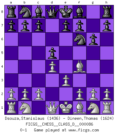 Last move : 0-1 2008 June 1 23:23:10 [Event "FICGS__CHESS__CLASS_D__000086"] [Site "FICGS"] [Date "2008.04.20"] [Round "1"] [White "Dsouza,Stanislaus"] [Black "Dineen,Thomas"] [Result "0-1"] [WhiteElo "1436"] [BlackElo "1624"] 1.d4 Nf6 2.Bf4 d5 3.e3 g6 0-1 This chess game has been lost on time (started : 2008.04.20 18:28:43) Queen's pawn game Player Black won this chess game. Follow this game move after move (download)Any material change in a position must come about by mate, a capture, or a Pawn promotion. (Purdy) Die Jungen erwarten, dass Opa einfach umfällt. Dann aber kann Opa fünf Stunden lang Schach spielen und die jungen Gegner an die Wand drücken. (Viktor Kortschnoi) En posiciones complicadas, Bobby Fischer pocas veces tuvo que temer de cualquiera. (Paul Keres) Ce qui est bien, c'est d'avoir tout un tas de pièces en prise : l'adversaire ne peut en prendre qu'une à la fois. Cité par Thierry Audin. The question of whether computers can think is just like question of whether submarines can swim. (Edsger W. Dijkstra)