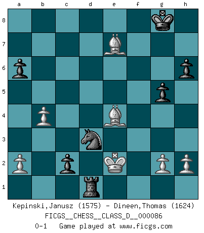 Last move : 0-1 2008 August 7 15:45:45 [Event "FICGS__CHESS__CLASS_D__000086"] [Site "FICGS"] [Date "2008.04.20"] [Round "1"] [White "Kepinski,Janusz"] [Black "Dineen,Thomas"] [Result "0-1"] [WhiteElo "1575"] [BlackElo "1624"] 1.e4 c5 2.Bc4 e6 3.Qe2 Nc6 4.Nf3 a6 5.c3 Be7 6.Bb3 d5 7.e5 c4 8.Bc2 f6 9.O-O fxe5 10.Nxe5 Nxe5 11.Qxe5 Nf6 12.d3 cxd3 13.Bxd3 Bd6 14.Qe2 O-O 15.Bg5 e5 16.Nd2 h6 17.Bh4 Qb6 18.b4 Bg4 19.Qe3 Qxe3 20.fxe3 Rac8 21.Rac1 e4 22.Bb1 Be5 23.c4 g5 24.Bf2 Be2 25.Rfe1 Bxc4 26.Nxc4 Rxc4 27.Rxc4 dxc4 28.Rd1 Ng4 29.Bg3 Nxe3 30.Re1 Bd4 31.Bf2 Nc2 32.Bxd4 Nxe1 33.Bxe4 Rd8 34.Bc3 Nd3 35.Bxb7 Nc1 36.Bf6 Rd6 37.Be7 Rd1+ 38.Kf2 c3 39.Be4 Nd3+ 40.Ke2 c2 0-1 Sicilian defense Kingside Castling by player White (move 9) Kingside Castling by player Black (move 14) Player Black won this chess game. Follow this game move after move (download)We cannot resist the fascination of sacrifice, since a passion for sacrifices is part of a Chessplayer's nature. (Rudolf Spielman) Schach ist das Spiel, das die Verrückten gesund hält. (Albert Einstein) Los finales de Peón son del Ajedrez lo que el cesped es del Golf. (Cecil Purdy) Toute estimation doit être constamment réévaluée. (Jacob Estrin) Drag your thoughts away from your troubles... by the ears, by the heels, or any other way you can manage it. (Mark Twain)