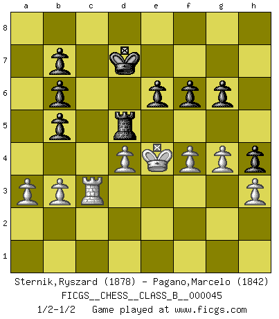 Last move : 1/2-1/2 2008 May 13 13:20:49 [Event "FICGS__CHESS__CLASS_B__000045"] [Site "FICGS"] [Date "2008.04.20"] [Round "1"] [White "Sternik,Ryszard"] [Black "Pagano,Marcelo"] [Result "1/2-1/2"] [WhiteElo "1878"] [BlackElo "1842"] 1.e4 c6 2.d4 g6 3.Nc3 Bg7 4.Nf3 d5 5.h3 dxe4 6.Nxe4 Nf6 7.Bd3 Nxe4 8.Bxe4 Bf5 9.Bxf5 Qa5+ 10.c3 Qxf5 11.Qb3 Qb5 12.Qxb5 cxb5 13.a3 Nd7 14.Bf4 O-O 15.O-O-O Nb6 16.d5 Rfd8 17.Bc7 Rd7 18.Bxb6 axb6 19.Rhe1 Kf8 20.Ne5 Rd6 21.Ng4 Rad8 22.Ne3 Bh6 23.Kc2 Ke8 24.Rd4 Bxe3 25.Rxe3 Rxd5 26.Red3 Rxd4 27.cxd4 Rd5 28.Kd2 e6 29.Ke3 Kd7 30.Rc3 h6 31.g4 h5 32.Ke4 f6 33.f4 h4 34.b3 1/2-1/2 Caro-Kann defense Kingside Castling by player Black (move 14) Queenside Castling by player White (move 15) This chess game ended in a draw. Follow this game move after move (download)Pawn endings are to Chess what putting is to golf. (Cecil Purdy) Zeige mir drei Eröffnungsvarianten und ich beweise dir, dass zwei davon inkorrekt sind. (Emanuel Lasker) Aunque la mayoría de la gente disfruta observar las partidas de los grandes Maestros de ataque, algunos de los jugadores mas notables en la historia han sido los jugadores silenciosos posicionales. Lentamente ellos te aplastan despojandote de tu espacio, congestionando tus piezas y dejandote virtualmente sin nada que hacer. (Yasser Seirawan) Si le désir cupide (et stupide) de gagner est une inépuisable source de souffrance, une combinaison brillante sur l'échiquier est une découverte : le coquelicot qui s'épanouit lorsque apparaît la Voie Lactée. (Arrabal) Big Chess is a place for big hallucinations. (Thibault de Vassal)