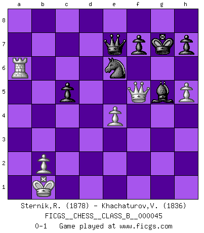 Last move : 0-1 2008 May 27 21:25:56 [Event "FICGS__CHESS__CLASS_B__000045"] [Site "FICGS"] [Date "2008.04.20"] [Round "1"] [White "Sternik,Ryszard"] [Black "Khachaturov,Vadim"] [Result "0-1"] [WhiteElo "1878"] [BlackElo "1836"] 1.e4 c5 2.Nf3 d6 3.d4 cxd4 4.Nxd4 Nf6 5.Nc3 a6 6.Be3 e5 7.Nb3 Be6 8.f3 Be7 9.Qd2 O-O 10.O-O-O Nbd7 11.g4 b5 12.g5 b4 13.Ne2 Ne8 14.f4 a5 15.f5 a4 16.Nbd4 exd4 17.Nxd4 b3 18.Kb1 bxc2+ 19.Nxc2 Bb3 20.axb3 axb3 21.Na3 Ne5 22.h4 Ra4 23.Qg2 Qa8 24.Bd4 Nc7 25.f6 Bd8 26.fxg7 Re8 27.Bxe5 Rxe5 28.Bd3 Ne6 29.Rhf1 Rd4 30.Qf3 Qb7 31.Nc4 Rc5 32.Nd2 Nf4 33.Ba6 Qxa6 34.Nxb3 Rxd1+ 35.Qxd1 Ne6 36.Nxc5 dxc5 37.Qf3 Qb7 38.Qf5 Qc7 39.Qd5 Kxg7 40.Qf5 Nd4 41.Qd5 Qe7 42.Rf6 Bc7 43.Ra6 Bf4 44.h5 Ne6 45.Qf5 Bxg5 0-1 Sicilian : Najdorf, Byrne (English) attack Kingside Castling by player Black (move 9) Queenside Castling by player White (move 10) Player Black won this chess game. Follow this game move after move (download)Fischer Chess play was always razor-sharp, rational and brilliant. One of the best ever. (Dave Regis) Der Bart als Geschlechtszeichen mitten im Gesicht ist obszön. Daher gefällt er den Weibern. [Zugegeben, kein Schachzitat, aber unglaublich originell] (Arthur Schopenhauer) La táctica fluye a partir de una posición superior. (Bobby Fischer) Je menace de comprendre la position. (Anonyme) Ah, beer! The cause of, and the solution to, all of life's problems. (Homer Simpson)