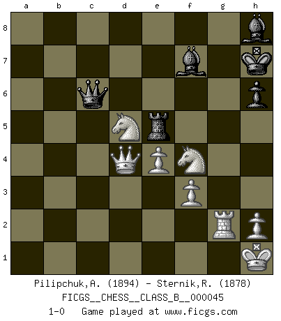Last move : 1-0 2008 June 15 22:52:26 [Event "FICGS__CHESS__CLASS_B__000045"] [Site "FICGS"] [Date "2008.04.20"] [Round "1"] [White "Pilipchuk,Andrey"] [Black "Sternik,Ryszard"] [Result "1-0"] [WhiteElo "1894"] [BlackElo "1878"] 1.d4 Nf6 2.c4 g6 3.Nc3 Bg7 4.Nf3 O-O 5.e4 d6 6.Be2 e5 7.O-O Nc6 8.d5 Ne7 9.Ne1 Nd7 10.Be3 f5 11.f3 f4 12.Bf2 g5 13.Rc1 Rf6 14.Nd3 Rh6 15.c5 a6 16.c6 bxc6 17.dxc6 Nxc6 18.Nxf4 Nd4 19.Bc4+ Kh8 20.Nfe2 Nb6 21.Bd5 Nxd5 22.Nxd5 c5 23.Be3 a5 24.Nec3 Ra7 25.Rf2 Rh4 26.a3 Rb7 27.b3 Be6 28.Rb1 h6 29.b4 axb4 30.axb4 g4 31.bxc5 Rxb1 32.Qxb1 gxf3 33.cxd6 Qxd6 34.gxf3 Rh3 35.Qf1 Kh7 36.Kh1 Qc6 37.Bxd4 exd4 38.Ne2 Rh4 39.Nef4 Bf7 40.Qb1 Be5 41.Nd3 Bg7 42.Rg2 Rh3 43.Qf1 Rh5 44.Qg1 Bh8 45.N3f4 Re5 46.Qxd4 1-0 King's Indian defense, 3.Nc3 Kingside Castling by player Black (move 4) Kingside Castling by player White (move 7) Player White won this chess game. Follow this game move after move (download)It is not a move, even the best move that you must seek, but a realizable plan. (Eugene Znosko-Borovsky) Herr Iljumschinow ist ein etwas merkwürdiger Geschäftsmann: Er arbeitet zusammen mit Leuten wie Muammar al-Gaddafi; früher ist das Saddam Hussein gewesen. (Joel Lautier) Una buena memoria, concentración, imaginación y una fuerte voluntad, se requiere para llegar a ser un buen jugador. (Bobby Fischer) L'action d'une oeuvre littéraire se déroule sur un champ de bataille. Les masques et les types du drame moderne correspondent aux pièces du jeu d'échecs. L'intrigue correspond aux coups et aux gambits, c'est à dire aux techniques du jeu telles qu'utilisées et interprétées par les joueurs. Les tactiques et les péripéties [mouvements] correspondent aux coups exécutés par l'adversaire. (Viktor Shklovsky) An expert is a man who has made all the mistakes which can be made in a very narrow field. (Niels Bohr)