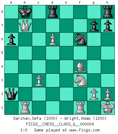 Last move : 1-0 2006 August 4 22:56:29 [Event "FICGS__CHESS__CLASS_G__000004"] [Site "FICGS"] [Date "2006.07.14"] [Round "1"] [White "Sarihan,Sefa"] [Black "Wright,Adam"] [Result "1-0"] [WhiteElo "1000"] [BlackElo "1200"] 1.e4 e5 2.f4 exf4 3.Nf3 d6 4.Bc4 c5 5.O-O Be6 6.Bxe6 fxe6 7.d4 Qb6 8.c3 e5 9.dxe5 c4 10.Kh1 Be7 11.exd6 Bxd6 12.e5 Be7 13.Qa4+ Nc6 14.Qxc4 O-O-O 15.Bxf4 Qxb2 16.Nbd2 a6 17.Ne4 Kb8 18.Nd6 Bxd6 19.exd6 Nf6 20.Rab1 Qa3 21.Qxc6 Qxa2 22.Qxb7+ 1-0 KGA : Fischer defense Kingside Castling by player White (move 5) Queenside Castling by player Black (move 14) Player White won this chess game. Follow this game move after move (download)A sacrifice is best refuted by accepting it. (Wilhelm Steinitz) Wenn Dein Gegner dir ein Remis anbietet, versuch herauszufinden, weshalb er glaubt schlechter zu stehen. (Nigel Short) Ser exitoso en el Ajedrez te permite descubrir tu propia personalidad. Eso es lo que deseo para los niños de mi clase. (Saudin Robovic) Le temps de noter son nom sur la feuille de partie, j'étais déjà en zeitnot ! D'un modeste amateur apparié lors de la première ronde d'un open contre le grand-maître Azmaïparashvili. The bottom line is always the bottom line. (Johann Piek)