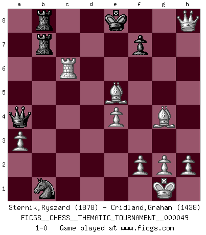 Last move : 1-0 2008 May 13 23:23:11 [Event "FICGS__CHESS__THEMATIC_TOURNAMENT__000049"] [Site "FICGS"] [Date "2008.04.21"] [Round "1"] [White "Sternik,Ryszard"] [Black "Cridland,Graham"] [Result "1-0"] [WhiteElo "1878"] [BlackElo "1438"] 1.c4 Nf6 2.b4 e6 3.a3 d5 4.e3 a5 5.b5 Be7 6.Nf3 O-O 7.Nc3 Nbd7 8.cxd5 exd5 9.Bb2 Nc5 10.Be2 Bf5 11.d3 a4 12.O-O c6 13.bxc6 bxc6 14.Nd4 Bd7 15.Qc2 Qa5 16.Rad1 Rab8 17.Nf3 Rb7 18.Rb1 Rfb8 19.d4 Nb3 20.Ne5 Be8 21.Bf3 Qa6 22.Rfe1 Nd7 23.Be2 Qb6 24.Nxa4 Qa5 25.Nxc6 Qxa4 26.Nxe7+ Kf8 27.Nxd5 Nf6 28.Nxf6 gxf6 29.Qxh7 Nd2 30.d5 Ke7 31.d6+ Ke6 32.e4 Nxb1 33.Qf5+ Kxd6 34.Qxf6+ Kc7 35.Be5+ Kc8 36.Rc1+ Bc6 37.Rxc6+ Kd7 38.Bg4+ Ke8 39.Qh8+ 1-0 English orang-utan Kingside Castling by player Black (move 6) Kingside Castling by player White (move 12) Player White won this chess game. Follow this game move after move (download)A great player and a great example for many. His book My 60 Memorable Games had a big impact on me. It is a shame he didn't continue to enrich the world of chess with his unparalleled understanding after 1972. (Jan Timman, about Bobby Fischer's death) Ja, ich habe einmal eine Blitzpartie gespielt, es war in einem Zug, 1929. --im Interview 1989 (Mikhail Moiseyevich Botvinik) Dejen al perfeccionista jugar por correo. (Yasser Seirawan) Les échecs, c'est l'imagination. (David Bronstein) When you don't know what to do, walk fast and look worried. (Anonymous)