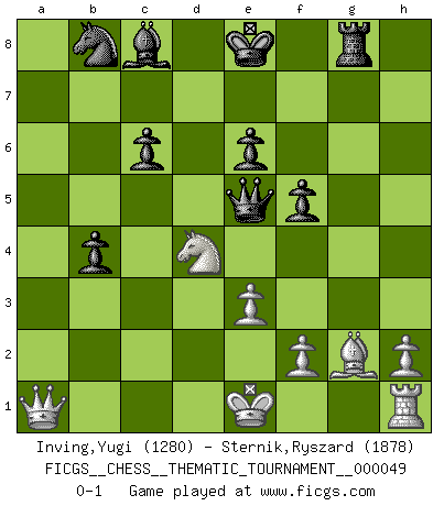 Last move : 0-1 2008 May 19 20:27:53 [Event "FICGS__CHESS__THEMATIC_TOURNAMENT__000049"] [Site "FICGS"] [Date "2008.04.21"] [Round "1"] [White "Inving,Yugi"] [Black "Sternik,Ryszard"] [Result "0-1"] [WhiteElo "1280"] [BlackElo "1878"] 1.c4 Nf6 2.b4 e6 3.a3 d5 4.Nf3 dxc4 5.Nc3 c6 6.Bb2 b5 7.e3 a5 8.bxa5 Qxa5 9.d3 Nd5 10.Qc1 cxd3 11.Bxd3 Nxc3 12.Bxc3 Bxa3 13.Qd2 b4 14.Bxg7 Rg8 15.Bb2 Rxg2 16.Kf1 Rg8 17.Bxh7 Qb5+ 18.Ke1 Bxb2 19.Qxb2 Rxa1+ 20.Qxa1 Rf8 21.Be4 f5 22.Nd4 Qe5 23.Bg2 Rg8 0-1 English orang-utan Player Black won this chess game. Follow this game move after move (download)Chess is war over the board. The object is to crush the opponents mind. (Bobby Fischer) Das Blackmar-Diemer-Gambit verändert den ganzen Menschen! (Emil Joseph Diemer) La batalla por la última verdad nunca sera ganada. Y es por eso que el Ajedrez es tan fascinante. (Hans Kmoch) Toute estimation doit être constamment réévaluée. (Jacob Estrin) Question: Is 'This statement is paradoxical' a paradoxical statement ? Or is it a meta-paradox ? (Normajean Yates)