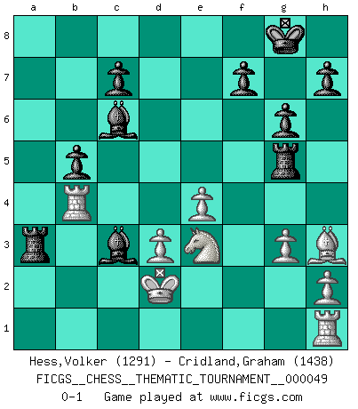 Last move : 0-1 2008 May 1 18:5:35 [Event "FICGS__CHESS__THEMATIC_TOURNAMENT__000049"] [Site "FICGS"] [Date "2008.04.21"] [Round "1"] [White "Hess,Volker"] [Black "Cridland,Graham"] [Result "0-1"] [WhiteElo "1291"] [BlackElo "1438"] 1.c4 Nf6 2.b4 e5 3.Qb3 d5 4.Nf3 dxc4 5.Qxc4 Be6 6.Qb5+ Nc6 7.Nxe5 Qd5 8.Qxd5 Bxd5 9.Nxc6 Bxc6 10.a3 a5 11.bxa5 Rxa5 12.d3 Bc5 13.e4 Ng4 14.Be3 Nxe3 15.fxe3 Bxe3 16.Nd2 Bd4 17.Nc4 Rg5 18.Rb1 O-O 19.g3 Ra8 20.Bh3 g6 21.Kd2 b5 22.Ne3 Rxa3 23.Rb4 Bc3+ 0-1 English orang-utan Kingside Castling by player Black (move 18) Player Black won this chess game. Follow this game move after move (download)The stomach is an essential part of the Chess master. (Bent Larsen) Über Karpov: Er war und ist ein Vertreter der russischen Reaktionäre. Das steckt tief in seiner Seele, wehalb ich nicht nett mit ihm umgehen kann. (Viktor Kortschnoi) ¿Porque tengo que perder ante este idiota?. (Aron Nimzovich) Horreur, mais aussi harmonie suprême : qu'y avait-il en effet au monde en dehors des échecs ? Le brouillard, l'inconnu, le non-être... (Vladimir Nabokov) The arrogant army will lose certainly the battle. (Chinese proverb)