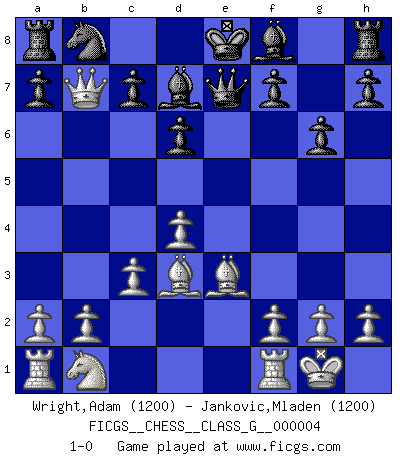 Last move : 1-0 2006 November 10 14:55:3 [Event "FICGS__CHESS__CLASS_G__000004"] [Site "FICGS"] [Date "2006.07.14"] [Round "1"] [White "Wright,Adam"] [Black "Jankovic,Mladen"] [Result "1-0"] [WhiteElo "1200"] [BlackElo "1200"] 1.e4 e5 2.Nf3 Nc6 3.c3 Nf6 4.Qb3 Nxe4 5.Nxe5 Nxe5 6.Qd5 d6 7.Qxe4 Bd7 8.Qxb7 Nc6 9.d4 Na5 10.Qa6 Nc6 11.Bd3 Qe7 12.Be3 g6 13.O-O Nb8 14.Qb7 1-0 Ponziani : Jaenisch counter-attack Kingside Castling by player White (move 13) Player White won this chess game. Follow this game move after move (download)Some part of a mistake is always correct. (Savielly Tartakover) Nur ein wirklich starker Spieler weiß wie schwach er spielt. (Savielly Grigorievitsch Tartakower) Cuando estes solo, cuando te sientas un extraño en el mundo, juega al Ajedrez. Esto levantará tu espiritu y será tu consejero de guerra. (Aristóteles) C'est la seule position que je connaisse où les deux camps sont mals. Propos prêtés à V. Anand. CHESS, n. f. [echecs, Fr.] A nice and abstruse game, in which two sets of puppets are moved in opposition to each other. (Dr Samuel Johnson, A Dictionary Of The English Language, 1755)