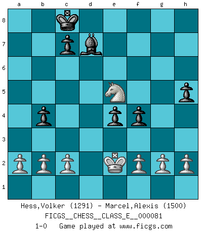 Last move : 1-0 2008 May 5 14:14:40 [Event "FICGS__CHESS__CLASS_E__000081"] [Site "FICGS"] [Date "2008.04.21"] [Round "1"] [White "Hess,Volker"] [Black "Marcel,Alexis"] [Result "1-0"] [WhiteElo "1291"] [BlackElo "1500"] 1.e4 e5 2.Nf3 Nf6 3.d4 Nxe4 4.dxe5 d6 5.Bd3 d5 6.Bxe4 dxe4 7.Qxd8+ Kxd8 8.Nd4 Bd7 9.O-O Nc6 10.Nxc6+ Bxc6 11.Rd1+ Ke7 12.Bg5+ f6 13.exf6+ gxf6 14.Be3 Bg7 15.Nc3 b6 16.Rd2 Rhd8 17.Rad1 f5 18.Bd4 Bxd4 19.Rxd4 Rxd4 20.Rxd4 Rd8 21.Rxd8 Kxd8 22.Kf1 b5 23.Ke2 b4 24.Nd1 a5 25.Ne3 Bd7 26.Nc4 f4 27.Nxa5 Kc8 28.Nc4 h5 29.Ne5 1-0 Petrov : Modern attack, Symmetrical variation Kingside Castling by player White (move 9) Player White won this chess game. Follow this game move after move (download)We must make sure that Chess will not be like a dead language, very interesting, but for a very small group. (Sytze Faber) Modernes Schach erfordert enorme Anspannung. Es ist für einen normalen Menschen unmöglich das auszuhalten. (Viktor Kortschnoi) Me dio la sensación de como si yo estuviera jugando en contra del mismo Ajedrez. - al estar jugando en contra de Robert Fischer (Walter Shipman) Aux échecs, les retours au sommet sont rares : les dommages psychologiques consécutifs à une défaite sont trop sévères. (Daily Telegraph) Memory is a crazy woman that hoards colored rags and throws away food. (Austin O'Malley)