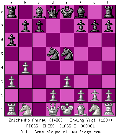Last move : 0-1 2008 April 27 18:57:48 [Event "FICGS__CHESS__CLASS_E__000081"] [Site "FICGS"] [Date "2008.04.21"] [Round "1"] [White "Zaichenko,Andrey"] [Black "Inving,Yugi"] [Result "0-1"] [WhiteElo "1486"] [BlackElo "1280"] 1.b4 Nf6 2.Bb2 a6 3.e3 e5 4.a3 Nc6 5.c4 d5 6.cxd5 Nxd5 7.Bxe5 Nxe5 0-1 Polish (Sokolsky) opening Player Black won this chess game. Follow this game move after move (download)A good sacrifice is one that is not necessarily sound but leaves your opponent dazed and confused. (Rudolph Spielmann) Frage des Reporters: -Welche besonderen Umstände rechtfertigen das Anhalten der Uhren während einer Turnierpartie? Antwort: -Einen Fotographen zu strangulieren. (Siegbert Tarrasch) Cada Peón es una Reina en potencia. (James Mason) Karpov est une pièce de musée. (Garry Kasparov) Fame, I have already. Now I need the money. (an elderly Steinitz)