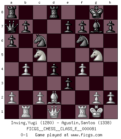 Last move : 0-1 2008 June 8 21:12:12 [Event "FICGS__CHESS__CLASS_E__000081"] [Site "FICGS"] [Date "2008.04.21"] [Round "1"] [White "Inving,Yugi"] [Black "Agustin,Santos"] [Result "0-1"] [WhiteElo "1280"] [BlackElo "1338"] 1.f4 Nf6 2.e3 d5 3.Nf3 g6 4.Bb5+ c6 5.Be2 c5 6.O-O Nc6 7.Nc3 Bg7 8.d4 Qa5 9.dxc5 Qxc5 10.Na4 Qa5 11.Nc3 O-O 12.Bd2 Qb6 13.Rb1 Bf5 14.Nh4 Be4 15.Nf3 a6 16.Ng5 Bf5 17.Na4 Qa7 18.Bd3 Rfd8 19.Bxf5 gxf5 20.b4 d4 21.e4 fxe4 22.Nc5 e3 0-1 Bird's Opening Kingside Castling by player White (move 6) Kingside Castling by player Black (move 11) Player Black won this chess game. Follow this game move after move (download)The Pin is mightier than the sword. (Fred Reinfeld) Ich tröste mich mit dem Vergnügen, daß Schachfans, Zuschauer und Leser glücklich sind, wenn ein Großmeister etwas riskiert, statt nur Klötzchen zu schieben. (Mikhail Nekhemyevich Tal) El Ajedrez es tortura mental. (Garry Kasparov) Assurément je connaissais par expérience le mystérieux attrait de ce jeu royal, le seul entre tous les jeux inventés par les hommes qui échappe souverainement à la tyrannie du hasard, le seul où l'on ne doive sa victoire qu'à son intelligence ou plutôt à une certaine forme d'intelligence. Mais n'est-ce pas déjà le limiter injurieusement que d'appeler les échecs un jeu ? N'est-ce pas une science, un art ou quelque chose qui, comme le cercueil de Mahomet entre ciel et terre, est suspendu entre l'un et l'autre, et qui réunit un nombre incroyable de contraires ? [...] C'est une pensée qui ne mène à rien, une mathématique qui n'établit rien, un art qui ne laisse pas d'uvre, une architecture sans matière; et il l'a prouvé néanmoins qu'il était plus durable, à sa manière, que les livres ou que tout autre monument, ce jeu unique qui appartient à tous les peuples et à tous les temps, et dont personne ne sait quel dieu en fit don à la terre pour tuer l'ennui, pour aiguiser l'esprit et stimuler l'âme. Où commence-t-il, où finit-il ? (Stefan Zweig) You can think I'm wrong, but that's no reason to quit thinking. (Gregory House, House M.D.)