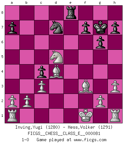 Last move : 1-0 2008 May 15 7:11:27 [Event "FICGS__CHESS__CLASS_E__000081"] [Site "FICGS"] [Date "2008.04.21"] [Round "1"] [White "Inving,Yugi"] [Black "Hess,Volker"] [Result "1-0"] [WhiteElo "1280"] [BlackElo "1291"] 1.f4 d6 2.Nc3 Nf6 3.Nf3 g6 4.e4 Bg7 5.d4 Bg4 6.h3 Bxf3 7.Qxf3 c5 8.e5 dxe5 9.dxe5 Nfd7 10.Qxb7 O-O 11.Qxa8 Qb6 12.Nd5 Qe6 13.Qb7 Nxe5 14.fxe5 Qxe5+ 15.Be2 Qg3+ 16.Kf1 Bd4 17.Nxe7+ Kg7 18.Qf3 Qxf3+ 19.Bxf3 Re8 20.Nd5 Nd7 21.c3 Be3 22.Bxe3 c4 23.Bd4+ 1-0 Bird's Opening Kingside Castling by player Black (move 10) Player White won this chess game. Follow this game move after move (download)Discovered check is the dive bomber of the Chessboard. (Reuben Fine) Wenn Spassky eine Figur opfert kannst du genauso gut aufgeben. Aber wenn Tal eine Figur opfert, spiel weiter. Er könnte noch eine weitere opfern, und dann ... wer weiß? (Miguel Najdorf) Nunca antes ha habido un jugador de Ajedrez con tal conocimiento a fondo de las complejidades del juego y una inmensa voluntad absolutamente indomable de ganar. Yo pienso que Fischer es el jugador mas grande que jamás haya existido. (Lisa Lane) Lorsque vous vous retrouvez devant une position atroce, ne tendez pas un ultime piège dérisoire avec l'intention d'abandonner si l'adversaire le déjoue ! Faites-vous plutôt un devoir de résister comme si votre vie en dépendait. Jouez le coup qui vous déplairait au centuple si vous étiez dans la peau de votre tortionnaire ! Luck never made a man wise. (Seneca, Letters to Lucilius)
