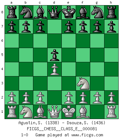 Last move : 1-0 2008 June 4 11:35:28 [Event "FICGS__CHESS__CLASS_E__000081"] [Site "FICGS"] [Date "2008.04.21"] [Round "1"] [White "Agustin,Santos"] [Black "Dsouza,Stanislaus"] [Result "1-0"] [WhiteElo "1338"] [BlackElo "1436"] 1.d4 d5 2.Nf3 1-0 This chess game has been lost on time (started : 2008.04.21 11:8:46) Queen's pawn game Player White won this chess game. Follow this game move after move (download)When you don't know what to do, wait for your opponent to get an idea - it's sure to be wrong. (Tarrasch) Ich verstehe mehr vom Schach als irgendein anderer lebender Meister. (José Raúl Capablanca) ¿Esta Bobby Fischer algo cuerdo?. (Salo Flohr) Botvinnik disait en comparant les échecs à la musique: Il existe une science dont le but est l'étude de l'acoustique et des sons. Mais il y a aussi un art qui se sert de l'océan des sons : c'est la musique. De toute évidence, il en est de même pour la pensée. La logique est l'étude des lois de la réflexion et les échecs reflètent, en tant qu'art, le côté logique de la réflexion, sous la forme d'images artistiques... Extrait de Fischer - Spassky, Reykjavik 1972 par Alexander & F. Wyndham (Ed. Solar), p 37. When it is a question of money, everybody is of the same religion. (Voltaire)