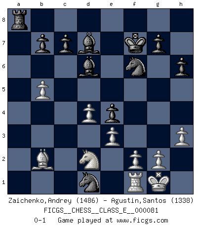 Last move : 0-1 2008 May 31 9:4:17 [Event "FICGS__CHESS__CLASS_E__000081"] [Site "FICGS"] [Date "2008.04.21"] [Round "1"] [White "Zaichenko,Andrey"] [Black "Agustin,Santos"] [Result "0-1"] [WhiteElo "1486"] [BlackElo "1338"] 1.b4 Nf6 2.Bb2 e6 3.b5 d5 4.e3 a6 5.a4 axb5 6.axb5 Rxa1 7.Bxa1 Nbd7 8.Nf3 Bd6 9.c4 O-O 10.Be2 dxc4 11.Bxc4 Nb6 12.Be2 Qe7 13.O-O e5 14.d3 Bd7 15.Nc3 Ra8 16.Bb2 h6 17.h3 Qe6 18.d4 e4 19.Nd2 Nbd5 20.Bc4 Nxc3 21.Bxe6 Nxd1 22.Bxf7+ Kxf7 0-1 Polish (Sokolsky) opening Kingside Castling by player Black (move 9) Kingside Castling by player White (move 13) Player Black won this chess game. Follow this game move after move (download)A win by an unsound combination, however showy, fills me with artistic horror. (Wilhelm Steinitz) Kritik überlasse ich den Spießern. Ich zeige nichts, wofür ich mich schämen muss. (Alexandra Kosteniuk) Para mi, el Ajedrez es la vida y cada partida es como una nueva vida. Todo jugador de Ajedrez suele vivir muchas vidas durante su vida. (Eduard Gufeld) Je crois qu'il existe des manières très spécifiques de jouer efficacement contre une machine. Evidemment, nous n'avons aucune chance en technique pure, parce que l'ordinateur calcule de manière parfaite. Mais lorsque nous faisons appel à notre cerveau, en utilisant l'intuition et la compréhension, alors nous restons beaucoup plus forts. (Anatoli Karpov) The best teachers teach from the heart, not from the book. (Author unknown)