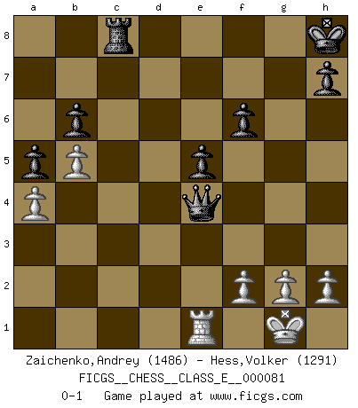 Last move : 0-1 2008 May 5 10:26:56 [Event "FICGS__CHESS__CLASS_E__000081"] [Site "FICGS"] [Date "2008.04.21"] [Round "1"] [White "Zaichenko,Andrey"] [Black "Hess,Volker"] [Result "0-1"] [WhiteElo "1486"] [BlackElo "1291"] 1.b4 a5 2.b5 c6 3.e4 e5 4.Qh5 d6 5.Qd1 Nf6 6.d3 Be7 7.a4 Bd7 8.c4 O-O 9.Be2 d5 10.exd5 cxd5 11.cxd5 Nxd5 12.Nf3 Nb4 13.O-O Bf6 14.Nc3 e4 15.Nxe4 Bxa1 16.d4 Bf5 17.Ng3 Bg6 18.Bg5 f6 19.Bc4+ Bf7 20.Bxf7+ Rxf7 21.Be3 Bc3 22.Ne4 Nd5 23.Nxc3 Nxc3 24.Qb3 Ne4 25.d5 Kh8 26.Qc4 Nd6 27.Qg4 Nd7 28.Rd1 Ne5 29.Nxe5 fxe5 30.Bc5 b6 31.Ba3 Rd7 32.Qe6 Nc4 33.Bc1 Qe8 34.Qg4 Nd6 35.Re1 Rc8 36.Qg3 Ne4 37.Qg4 Nf6 38.Qf3 Rxd5 39.Bg5 Qg6 40.Bxf6 gxf6 41.Qxd5 Qc2 42.Qe4 Qxe4 0-1 Polish (Sokolsky) opening Kingside Castling by player Black (move 8) Kingside Castling by player White (move 13) Player Black won this chess game. Follow this game move after move (download)I won't play with you anymore. You have insulted my friend. - When an opponent cursed himself for a blunder. (Miguel Najdorf) Ich moechte nie einem Club beitreten, der Leute wie mich als Mitglieder aufnimmt. (Woody Allen) Cada Peón es potencialmente una Reina. (James Mason) Le succès, c'est être capable d'aller d'échec en échec sans perdre son enthousiasme. (Winston Churchill) When you have everything, sometimes it feels like nothing. (Horatio Caine, C.S.I. Miami)