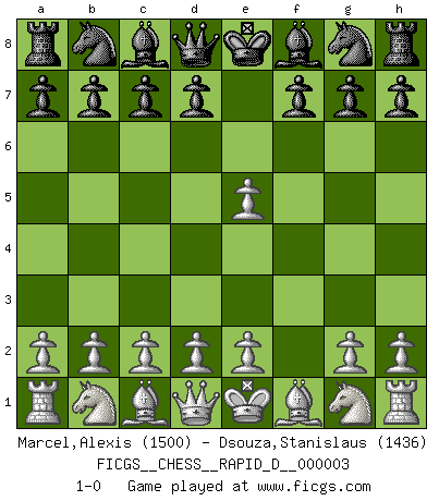 Last move : 1-0 2008 May 30 23:14:5 [Event "FICGS__CHESS__RAPID_D__000003"] [Site "FICGS"] [Date "2008.04.23"] [Round "1"] [White "Marcel,Alexis"] [Black "Dsouza,Stanislaus"] [Result "1-0"] [WhiteElo "1500"] [BlackElo "1436"] 1.f4 e5 2.fxe5 1-0 This chess game has been lost on time (started : 2008.04.23 19:11:21) Bird : From gambit Player White won this chess game. Follow this game move after move (download)Half the variations which are calculated in a tournament game turn out to be completely superfluous. Unfortunately, no one knows in advance which half. (Jan Tinman) Über Kasparov: Es ist offensichtlich, daß er in einem totalitären Staat aufwuchs und deshalb zu diktatorischen Zügen neigt. (Viktor Kortschnoi) ¿Porque tengo que perder ante este idiota?. (Aron Nimzovich) Le pion, dans sa simplicité, marche droit devant lui, mais lorsqu'il prend, il le fait obliquement? Ainsi l'homme, tant qu'il reste pauvre, marche dans la droiture et vit honnêtement, mais lorsqu'il recherche les honneurs, il flatte, se parjure et, par les voies obliques, cherche une position supérieure sur l'échiquier du monde. (Jean de Galles) Everybody lies. (Gregory House, House M.D.)