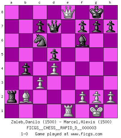 Last move : 1-0 2008 May 20 20:43:55 [Event "FICGS__CHESS__RAPID_D__000003"] [Site "FICGS"] [Date "2008.04.23"] [Round "1"] [White "Zaleb,Danilo"] [Black "Marcel,Alexis"] [Result "1-0"] [WhiteElo "1500"] [BlackElo "1500"] 1.e4 e5 2.Nf3 Nf6 3.Bc4 Nxe4 4.O-O Nd6 5.Nc3 Nxc4 6.d3 e4 7.Nxe4 Nd6 8.Re1 Nxe4 9.Rxe4+ Be7 10.b3 O-O 11.Bb2 Bf6 12.d4 d5 13.Re1 Nc6 14.c3 Be6 15.Ba3 Re8 16.b4 b5 17.Bb2 Bg4 18.Qd3 Rxe1+ 19.Rxe1 Bxf3 20.Qxf3 a5 21.Qe2 axb4 22.Qxb5 Qd7 23.Qe2 Rxa2 24.Qe8+ 1-0 Petrov : Italian variation Kingside Castling by player White (move 4) Kingside Castling by player Black (move 10) Player White won this chess game. Follow this game move after move (download)Checkers is for tramps. (Paul Morphy) Wenn Capablanka heute auf der Schachbühne erscheinen würde, hätte er ein halbes Jahr gebraucht um sich die Schachtheorie anzueignen. Und dann hätte er alles und jeden besiegt. (Mikhail Moiseyevich Botvinik) El jugador táctico debe saber que hacer cuando algo se debe de hacer. El estratégico debe saber que hacer cuando nada se debe de hacer. (Savielly Tartakover) Un footballeur joue avec ses pieds, parfois avec sa tête. Un joueur d'échecs ne joue qu'avec sa tête. Et quand il ne joue plus, il meurt. (Jacob Murray) A person who never made a mistake never tried anything new. (Albert Einstein)