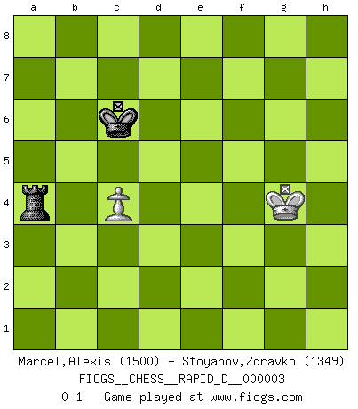 Last move : 0-1 2008 May 17 19:58:50 [Event "FICGS__CHESS__RAPID_D__000003"] [Site "FICGS"] [Date "2008.04.23"] [Round "1"] [White "Marcel,Alexis"] [Black "Stoyanov,Zdravko"] [Result "0-1"] [WhiteElo "1500"] [BlackElo "1349"] 1.f4 c6 2.Nf3 e6 3.e3 Nf6 4.Be2 d5 5.O-O Bc5 6.b3 h6 7.Bb2 Qb6 8.Bxf6 gxf6 9.Nc3 d4 10.exd4 Bxd4+ 11.Kh1 Bxc3 12.dxc3 Nd7 13.c4 Nc5 14.c3 Bd7 15.b4 Ne4 16.Qe1 O-O-O 17.c5 Qc7 18.g3 h5 19.Rd1 e5 20.Bc4 Bh3 21.Rxd8+ Rxd8 22.Rg1 exf4 23.Qxe4 fxg3 24.hxg3 Bg4 25.a4 Rh8 26.b5 f5 27.Qd4 Bxf3+ 28.Kh2 Rd8 29.Qe3 Bg4 30.Re1 h4 31.Be2 Rh8 32.Bxg4 hxg3+ 33.Kg2 fxg4 34.Qxg3 Qd7 35.c4 Qd2+ 36.Kg1 f5 37.Qe3 Qd7 38.Qe5 Rd8 39.Rf1 Qd4+ 40.Qxd4 Rxd4 41.Rc1 Kd7 42.Kf2 cxb5 43.axb5 Rd3 44.Ke2 Rh3 45.Rf1 Rh5 46.Rd1+ Ke6 47.Rd6+ Ke7 48.Rd5 Ke6 49.Rd6+ Ke7 50.Rd5 Ke8 51.Re5+ Kd7 52.Rd5+ Kc7 53.Kf2 a6 54.Kg3 a5 55.c6 bxc6 56.bxc6 Kxc6 57.Rxa5 f4+ 58.Kxf4 Rxa5 59.Kxg4 Ra4 0-1 Bird's Opening Kingside Castling by player White (move 5) Queenside Castling by player Black (move 16) 10 pieces endgame at move 55 : White KRPP , Black KRPPPP WHITE : King + 1 Rook 2 Pawns BLACK : King + 1 Rook 4 Pawns 9 pieces endgame at move 56 : White KRPP , Black KRPPP WHITE : King + 1 Rook 2 Pawns BLACK : King + 1 Rook 3 Pawns 8 pieces endgame at move 56 : White KRP , Black KRPPP WHITE : King + 1 Rook 1 Pawn BLACK : King + 1 Rook 3 Pawns 7 pieces endgame at move 57 : White KRP , Black KRPP WHITE : King + 1 Rook 1 Pawn BLACK : King + 1 Rook 2 Pawns 6 pieces endgame at move 58 : White KRP , Black KRP WHITE : King + 1 Rook 1 Pawn BLACK : King + 1 Rook 1 Pawn 5 pieces endgame at move 58 : White KP , Black KRP WHITE : King + 1 Pawn BLACK : King + 1 Rook 1 Pawn 4 pieces endgame at move 59 : White KP , Black KR WHITE : King + 1 Pawn BLACK : King + 1 Rook Player Black won this chess game. Follow this game move after move (download)Becoming successful at Chess allows you to discover your own personality. That's what I want for the kids I teach. (Saudin Robovic) Ein Isolani verdüstert die Stimmung auf dem ganzen Schachbrett. (Savielly Grigorievitsch Tartakower) Preferería tener un Peón que un dedo. (Reuben Fine) Même si l'adversaire joue le coup analysé précédemment, recommencez l'analyse en voyant la nouvelle position. Première règle de Blumenfeld The beginning is the most important part of the work. (Plato)