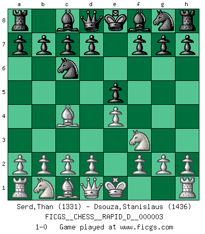 Last move : 1-0 2008 May 27 10:49:12 [Event "FICGS__CHESS__RAPID_D__000003"] [Site "FICGS"] [Date "2008.04.23"] [Round "1"] [White "Serd,Than"] [Black "Dsouza,Stanislaus"] [Result "1-0"] [WhiteElo "1331"] [BlackElo "1436"] 1.e4 e5 2.Nf3 Nc6 3.Bc4 1-0 This chess game has been lost on time (started : 2008.04.23 19:11:21) King's pawn game Player White won this chess game. Follow this game move after move (download)Chess is the art which expresses the science of logic. (Mikhail Botvinnik) Korrekt heißt in Deutschland die Haltung eines Mannes, dessen Benehmen nach dem Urteile seiner Nachbarn seiner Stellung angemessen ist. Um korrekt zu sein, muß man sich der Meinung der anderen anpassen... (Emanuel Lasker) Fischer deseaba darle a los Rusos una sopa de su propia medicina. (Larry Evans) A chaque perte on perd un peu de soi. (Joël Lautier) They misunderestimated me. (George W. Bush, Bentonville nov. 6, 2000)