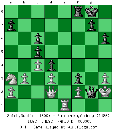 Last move : 0-1 2008 May 29 23:49:59 [Event "FICGS__CHESS__RAPID_D__000003"] [Site "FICGS"] [Date "2008.04.23"] [Round "1"] [White "Zaleb,Danilo"] [Black "Zaichenko,Andrey"] [Result "0-1"] [WhiteElo "1500"] [BlackElo "1486"] 1.e4 e5 2.Nf3 Nf6 3.Bc4 Nc6 4.O-O Nxe4 5.Re1 d5 6.Bb5 Bd6 7.Bxc6+ bxc6 8.d3 Nf6 9.Nxe5 Bxe5 10.Rxe5+ Be6 11.Re1 O-O 12.Bg5 h6 13.Be3 Ng4 14.h3 Nxe3 15.Rxe3 d4 16.Re1 c5 17.Na3 c6 18.c4 Qd7 19.b3 f5 20.Qd2 f4 21.Qe2 Rae8 22.Qd2 Bxh3 23.Rxe8 Qxe8 24.gxh3 f3 25.Re1 Qg6+ 26.Kh2 Qg2+ 0-1 Petrov : Italian variation Kingside Castling by player White (move 4) Kingside Castling by player Black (move 11) Player Black won this chess game. Follow this game move after move (download)In complicated positions, Bobby Fischer hardly had to be afraid of anybody. (Paul Keres) Im Blitz ist es einfacher mit einer Figur weniger anzugreifen, als sich mit einer Mehrfigur zu verteidigen. (Mikhail Nekhemyevich Tal) Un jugador que trata de regresar una movida en el Ajedrez es un futuro carterista. (Richard Fenton) C'est une question de caractère, Beaucoup de gens perdent leur motivation très vite. D'autres, ils sont rares, peuvent la conserver très longtemps. J'aime les échecs, encore aujourd'hui je suis heureux d'analyser des parties. J'aime toujours gagner, je déteste encore perdre. Bien jouer est important pour mon intégrité intellectuelle et morale. Et puis les échecs vivent en ce moment une période historique grâce à Internet. Ils se développent dans les systèmes éducatifs à travers le monde. Ils sortent de leur ghetto, et c'est mon rôle de mener à bien cette révolution. (Gary Kasparov) They say poker is a zero-sum game. It must be, because every time I play my sum ends up zero. (Max Shapiro)
