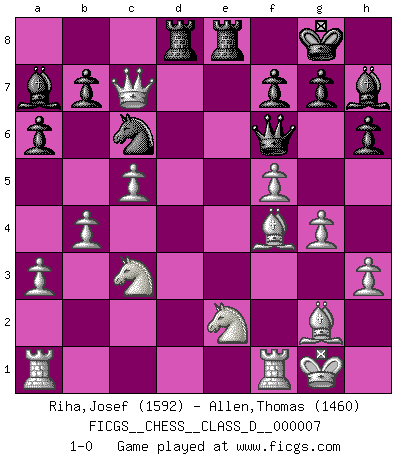 Last move : 1-0 2006 November 3 8:53:36 [Event "FICGS__CHESS__CLASS_D__000007"] [Site "FICGS"] [Date "2006.07.14"] [Round "1"] [White "Riha,Josef"] [Black "Allen,Thomas"] [Result "1-0"] [WhiteElo "1592"] [BlackElo "1460"] 1.c4 e5 2.g3 Nf6 3.Bg2 Nc6 4.Nc3 Bc5 5.a3 a6 6.e3 O-O 7.Nge2 d6 8.O-O Bg4 9.h3 Bh5 10.g4 Bg6 11.d4 exd4 12.exd4 Ba7 13.f4 h6 14.f5 Bh7 15.b4 Re8 16.Bf4 Nd7 17.c5 dxc5 18.dxc5 Qf6 19.Qxd7 Rad8 20.Qxc7 1-0 This chess game has been lost on time (started : 2006.07.14 18:32:41) English Opening Kingside Castling by player Black (move 6) Kingside Castling by player White (move 8) Player White won this chess game. Follow this game move after move (download)Of Chess it has been said that life is not long enough for it, but that is the fault of life, not Chess. (William Ewart Napier) In der Schule lernt man nichts. Es ist nur Zeitverschwendung. (Robert James Fischer) Cuando tu no sabes absolutamente que mas hacer, es tiempo de entrar en pánico. (John van der Wiel) Toutes choses étant égales, c'est la conviction qui gagne. Alliée à une volonté de vaincre, elle sert de détonateur, suscite des idées, disperse les doutes et aide à penser clairement. (Robert Fischer) The Internet is the world's largest library. It's just that all the books are on the floor. (John Allen Paulos)
