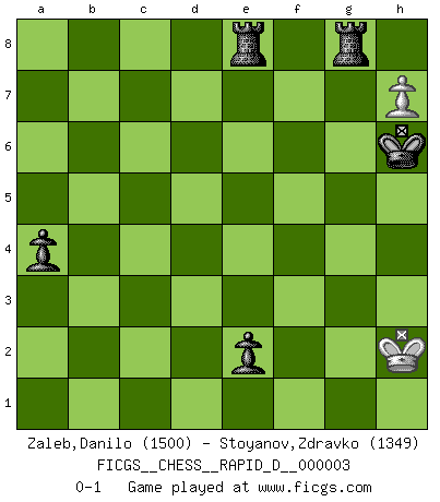Last move : 0-1 2008 June 10 18:54:47 [Event "FICGS__CHESS__RAPID_D__000003"] [Site "FICGS"] [Date "2008.04.23"] [Round "1"] [White "Zaleb,Danilo"] [Black "Stoyanov,Zdravko"] [Result "0-1"] [WhiteElo "1500"] [BlackElo "1349"] 1.e4 e6 2.Nf3 a6 3.Bc4 Bc5 4.d4 Be7 5.O-O c6 6.d5 b5 7.Bb3 h6 8.d6 Bf8 9.e5 f6 10.Nc3 fxe5 11.Nxe5 Qf6 12.Re1 a5 13.a3 a4 14.Ba2 Qf5 15.b3 Nf6 16.b4 Nd5 17.Bxd5 cxd5 18.Nxb5 Na6 19.Nc7+ Nxc7 20.dxc7 Bd6 21.Nd3 Bxc7 22.Bb2 Rg8 23.Be5 d6 24.Bg3 h5 25.Nf4 g6 26.Nxd5 Kd7 27.Ne3 Qf6 28.Nc4 d5 29.Bxc7 Kxc7 30.Ne5 Rf8 31.Rc1 Bb7 32.f3 Rad8 33.Qd4 Qg5 34.Nd3 Rxf3 35.Qe5+ Qxe5 36.Nxe5 Rxa3 37.Nxg6 Re8 38.Nf4 Kd6 39.Nxh5 Rc3 40.Nf4 e5 41.Nd3 e4 42.Nc5 Bc6 43.h4 e3 44.Nd3 Bb5 45.g4 Bxd3 46.cxd3 Rxd3 47.h5 d4 48.Kg2 Rb3 49.Rc4 Kd5 50.Rc5+ Ke6 51.h6 Rxb4 52.g5 Kf7 53.Rf5+ Kg6 54.Ra5 e2 55.Ra6+ Kxg5 56.h7 d3 57.Kf2 Rbe4 58.Ra7 Rf4+ 59.Kg3 Rf1 60.Rg7+ Kh6 61.Rxe2 dxe2 62.Rg8 Rg1+ 63.Kh2 R1xg8 0-1 French defense Kingside Castling by player White (move 5) 10 pieces endgame at move 55 : White KRRP , Black KRRPPP WHITE : King + 2 Rooks 1 Pawn BLACK : King + 2 Rooks 3 Pawns 9 pieces endgame at move 61 : White KRRP , Black KRRPP WHITE : King + 2 Rooks 1 Pawn BLACK : King + 2 Rooks 2 Pawns 8 pieces endgame at move 61 : White KRP , Black KRRPP WHITE : King + 1 Rook 1 Pawn BLACK : King + 2 Rooks 2 Pawns 7 pieces endgame at move 63 : White KP , Black KRRPP WHITE : King + 1 Pawn BLACK : King + 2 Rooks 2 Pawns Player Black won this chess game. Follow this game move after move (download)The older I grow, the more I value Pawns. (Keres) Ich brauche nur einen Blick auf das Schachbrett zu werfen, und weiß schon, was in der Stellung steckt, was geschehen kann und was geschehen wird. Alle übrigen suchen und prüfen, ich aber weiß es! (José Raúl Capablanca) Una partida de Ajedrez se divide en 3 etapas: la primera cuando piensas que tienes la ventaja, la segunda cuando crees que tienes la ventaja y la tercera... ¡cuando te das cuenta que vas a perder!. (Savielly Tartakower) Les pièces de l'échiquier étaient impitoyables. Elles le retenaient, elles l'absorbaient. Il y avait de l'horreur en cela, mais aussi une harmonie unique. Car, qu'y a-t-il dans le monde, à part les échecs ? (V. Nabokov) There is no instance of a country having benefited from prolonged warfare. (Sun Tzu)