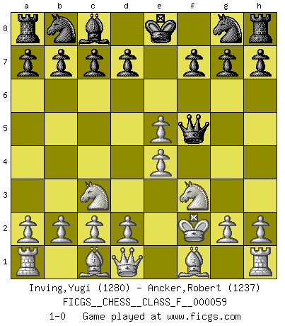 Last move : 1-0 2008 June 8 11:54:23 [Event "FICGS__CHESS__CLASS_F__000059"] [Site "FICGS"] [Date "2008.04.23"] [Round "1"] [White "Inving,Yugi"] [Black "Ancker,Robert"] [Result "1-0"] [WhiteElo "1280"] [BlackElo "1237"] 1.f4 e5 2.fxe5 Bc5 3.Nc3 Qg5 4.Nf3 Bf2+ 5.Kxf2 Qf5 6.e4 1-0 This chess game has been lost on time (started : 2008.04.23 22:4:58) Bird : From gambit Player White won this chess game. Follow this game move after move (download)All Chess players should have a hobby. (Savielly Tartakower) Wenn Du einsam bist, wenn Du Dich in der Welt wie ein Fremder fühlst, spiele Schach. Das wird Deinen Geist erheben und Dein Ratgeber im Kampf sein. (Aristoteles) La enorme capacidad mental, en la que sin ella no puede un jugador de Ajedrez existir, es demasiado requerida por el Ajedrez al grado de que nunca podrá liberar su mente de este juego. (Albert Einstein) On peut tirer plus d'utilité d'une partie perdue que de 100 parties gagnées. (Capablanca) The absolute truth is the thing that makes people laugh. (Carl Reiner)