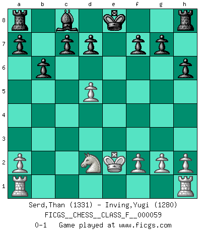 Last move : 0-1 2008 May 10 9:49:30 [Event "FICGS__CHESS__CLASS_F__000059"] [Site "FICGS"] [Date "2008.04.23"] [Round "1"] [White "Serd,Than"] [Black "Inving,Yugi"] [Result "0-1"] [WhiteElo "1331"] [BlackElo "1280"] 1.e4 e6 2.d4 Nf6 3.Nc3 Bb4 4.Bg5 h6 5.Bxf6 Qxf6 6.Nf3 Nc6 7.d5 Bxc3+ 8.bxc3 Qxc3+ 9.Nd2 exd5 10.exd5 Nb4 11.Bd3 Nxd3+ 12.cxd3 Qxd3 13.Qe2+ Qxe2+ 14.Kxe2 b6 0-1 French defense Player Black won this chess game. Follow this game move after move (download)Chess is the gymnasium of the mind. (Blaise Pascal) Im Schach gibt es keinen Platz für Galanterie. (Irving Chernev) No es una movida, aún la mejor movida que tu debas buscar, sino un plan comprensible. (Eugene Znosko-Borovsky) Des idées, des idées, j'en ai cent, j'en ai mille. Des bonnes, des mauvaises, applicables, irréalisables... Il suffit de faire le tri ! (Roos) The meaning of life is that it is to be lived, and it is not to be traded and conceptualized and squeezed into a pattern of systems. (Bruce Lee)