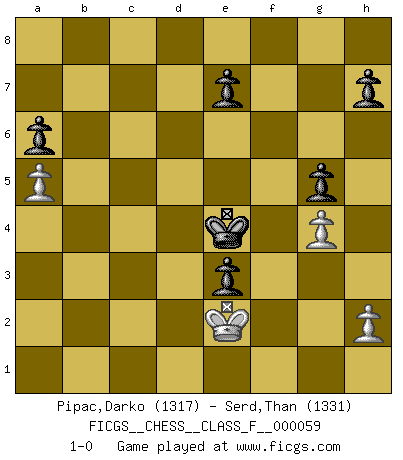 Last move : 1-0 2008 October 24 12:36:58 [Event "FICGS__CHESS__CLASS_F__000059"] [Site "FICGS"] [Date "2008.04.23"] [Round "1"] [White "Pipac,Darko"] [Black "Serd,Than"] [Result "1-0"] [WhiteElo "1317"] [BlackElo "1331"] 1.e4 c5 2.Nf3 d6 3.d4 cxd4 4.Nxd4 Nf6 5.Nc3 g6 6.Nf3 Bg7 7.Bd3 Nc6 8.O-O O-O 9.Re1 Bg4 10.Be2 Bxf3 11.Bxf3 Rc8 12.Bf4 Nd7 13.Be3 Nde5 14.Nb5 a6 15.Nd4 Nxf3+ 16.Nxf3 Bxb2 17.Rb1 Bc3 18.Bd2 Bxd2 19.Qxd2 b5 20.e5 dxe5 21.Qxd8 Rfxd8 22.Rbc1 f6 23.c4 Nd4 24.Nxd4 Rxd4 25.c5 Rc4 26.Rxc4 bxc4 27.f3 Rxc5 28.Rb1 Kf7 29.Kf1 c3 30.Ke2 c2 31.Rc1 Ke6 32.Kd2 Kd5 33.Rxc2 Rxc2+ 34.Kxc2 Kc4 35.g3 f5 36.a3 e4 37.fxe4 fxe4 38.Kd2 Kd4 39.Ke2 e3 40.a4 Ke4 41.a5 g5 42.g4 1-0 Sicilian : Dragon variation Kingside Castling by player White (move 8) Kingside Castling by player Black (move 8) 10 pieces endgame at move 37 : White KPPP , Black KPPPPP WHITE : King + 3 Pawns BLACK : King + 5 Pawns Player White won this chess game. Follow this game move after move (download)Chess holds its master in its own bonds, shackling the mind and brain so that the inner freedom of the very strongest must suffer. (Albert Einstein) Die Idee von Capablanca, Schach als Fach in den Schulen zu lehren, ist großartig. (Fidel Castro) El estómago es una parte esencial del maestro de Ajedrez. (Bent Larsen) Il vaut mieux sacrifier les pièces de l'adversaire. (Xavier Tartacover) If passion drives you, let reason holds the reins. (Benjamin Franklin)