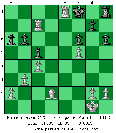 Last move : 1-0 2008 June 16 19:9:4 [Event "FICGS__CHESS__CLASS_F__000059"] [Site "FICGS"] [Date "2008.04.23"] [Round "1"] [White "Goodwin,Adam"] [Black "Stoyanov,Zdravko"] [Result "1-0"] [WhiteElo "1225"] [BlackElo "1349"] 1.e4 e5 2.Nf3 d6 3.d4 Bg4 4.dxe5 dxe5 5.Qxd8+ Kxd8 6.Nxe5 Be6 7.f4 Nf6 8.Nd2 Bd6 9.Ndc4 Bxe5 10.Nxe5 Nxe4 11.Bd3 Nc5 12.O-O Nxd3 13.Nxd3 Nc6 14.Be3 Bc4 15.Rfd1 Ke8 16.b3 Bxd3 17.Rxd3 b6 18.Re1 Ne7 19.Bc1 f6 20.Rde3 Kf8 21.Rxe7 c5 22.c4 a6 23.f5 Rd8 24.Rc7 Re8 25.Bd2 h6 26.Rxe8+ 1-0 Philidor's defense Kingside Castling by player White (move 12) Player White won this chess game. Follow this game move after move (download)A good sacrifice is one that is not necessarily sound but leaves your opponent dazed and confused. (Rudolph Spielmann) Bis jetzt ist Weiß einer wohlbekannten Analyse gefolgt. Aber jetzt begeht er einen schrecklichen Fehler: Er beginnt seinen eigenen Kopf zu benutzen. (Siegbert Tarrasch) Ser exitoso en el Ajedrez te permite descubrir tu propia personalidad. Eso es lo que deseo para los niños de mi clase. (Saudin Robovic) Tous ces prétendus hommes politiques sont les pions, les Cavaliers, les Tours ou les Fous d'une partie d'échecs qui se jouera tant qu'un hasard ne renversera pas l'échiquier. (Honoré de Balzac) Any activity becomes creative when the doer cares about doing it right or doing it better. (John Updike)