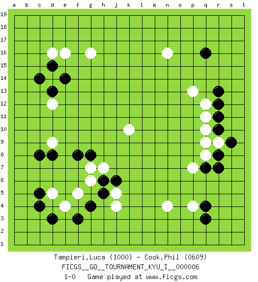 Last move : 1-0 2008 July 2 14:8:38 [Event "FICGS__GO__TOURNAMENT_KYU_I__000006 "] [Site "FICGS"] [Date "2008.04.24"] [Round "1"] [Black "Tampieri,Luca "] [White "Cook,Phil "] [Result "1-0"] [Rating 1 "1000"] [Rating 2 "0609"] 1.q16 d16 2.q4 e4 3.c5 d5 4.c4 n4 5.r7 n16 6.r13 p13 7.r10 q11 8.r11 q12 9.r12 q10 10.c14 d14 11.d13 d12 12.d15 g16 13.e14 e16 14.c8 d9 15.d8 p4 16.q3 q8 17.q7 p7 18.r8 r9 19.s9 q9 20.g4 f5 21.d3 k10 22.f8 g6 23.f3 j4 24.h5 j5 25.h6 g7 26.g8 h7 27.j6 1-0 This go game has been lost on time (started : 2008.04.24 19:48:31) Here are the names of the openings (joseki) played in the four corners : Corner d4 : e4 c5Takamoku (Gomok, Gaomu`) 5-4 Point. The takamoku (high) point (5-4). With its emphasis on influence, the 5-4 point complements the 4-4 (hoshi) point in creating an influence-oriented fuseki. Corner q4 : q4 n4Hoshi (Hwajeom, Seongjeom, Xingwei`) 4-4 Point. The star or hoshi (4-4) point, emphasizing influence at the potential expense of territory.Nikken Takagakari (Dukan Nop'dakeolch'im, E`r Gaojia, 2-Space High Approach). White 2 is a light approach move. Rarely played in even games, White 2 is typically employed in handicap games. Black continues with 6-4 or 3-10. In Korean Sunjang Baduk Black has a stone on 8-4. Corner q16 : q16 n16Hoshi (Hwajeom, Seongjeom, Xingwei`) 4-4 Point. The star or hoshi (4-4) point, emphasizing influence at the potential expense of territory.Nikken Takagakari (Dukan Nop'dakeolch'im, E`r Gaojia, 2-Space High Approach). White 2 is a light approach move. Rarely played in even games, White 2 is typically employed in handicap games. Black continues with 6-4 or 3-10. In Korean Sunjang Baduk Black has a stone on 8-4. Corner d16 : d16 c14Hoshi (Hwajeom, Seongjeom, Xingwei`) 4-4 Point. The star or hoshi (4-4) point, emphasizing influence at the potential expense of territory.Ikken Kakari (Hankan Keolch'im, Yi Gua`jiao~, 1-Space Low Approach). Black 2 is the standard approach move to the 4-4. Player Black won this Go (weiqi, baduk) game.Follow this game move after move (download ) In the corner, five stones in a row on the third line are alive. (Anonymous) Don't be irreplaceable, if you can't be replaced, you can't be promoted. (Dan Rotaru)