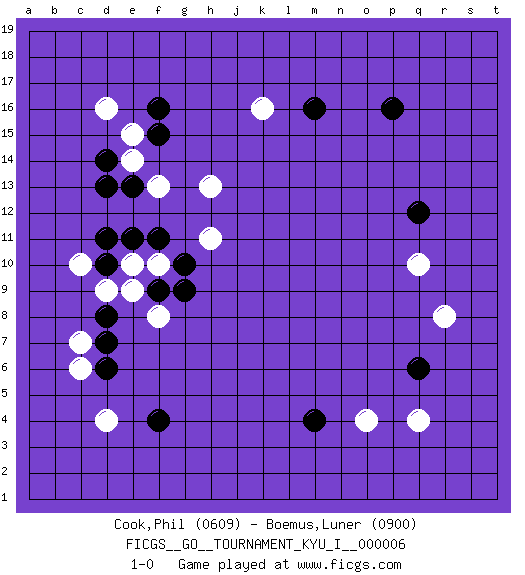 Last move : 1-0 2008 July 17 15:14:18 [Event "FICGS__GO__TOURNAMENT_KYU_I__000006 "] [Site "FICGS"] [Date "2008.04.24"] [Round "1"] [Black "Cook,Phil "] [White "Boemus,Luner "] [Result "1-0"] [Rating 1 "0609"] [Rating 2 "0900"] 1.p16 d4 2.f4 d16 3.f16 q4 4.q6 o4 5.d13 e14 6.e13 f13 7.d14 e15 8.f15 h13 9.d6 k16 10.m16 d9 11.m4 q10 12.q12 r8 13.d10 c10 14.d11 c7 15.d7 c6 16.d8 e9 17.f9 e10 18.e11 f10 19.f11 h11 20.g10 f8 21.g9 1-0 This go game has been lost on time (started : 2008.04.24 19:48:31) Here are the names of the openings (joseki) played in the four corners : Corner d4 : d4 f4Hoshi (Hwajeom, Seongjeom, Xingwei`) 4-4 Point. The star or hoshi (4-4) point, emphasizing influence at the potential expense of territory.Ikken Takagakari (Hankan Nop'dakeolch'im, Yi Gaojia, 1-Space High Approach). White typically responds at 6-4 or 3-10. White 4-10 is played when White finds play on the right side advantageous. White 4-8 or 3-8 may be played when White has support at top. Corner d16 : d16 f16Hoshi (Hwajeom, Seongjeom, Xingwei`) 4-4 Point. The star or hoshi (4-4) point, emphasizing influence at the potential expense of territory.Ikken Takagakari (Hankan Nop'dakeolch'im, Yi Gaojia, 1-Space High Approach). White typically responds at 6-4 or 3-10. White 4-10 is played when White finds play on the right side advantageous. White 4-8 or 3-8 may be played when White has support at top. Corner q4 : q4 q6Hoshi (Hwajeom, Seongjeom, Xingwei`) 4-4 Point. The star or hoshi (4-4) point, emphasizing influence at the potential expense of territory.Ikken Takagakari (Hankan Nop'dakeolch'im, Yi Gaojia, 1-Space High Approach). White typically responds at 6-4 or 3-10. White 4-10 is played when White finds play on the right side advantageous. White 4-8 or 3-8 may be played when White has support at top. Player Black won this Go (weiqi, baduk) game.Follow this game move after move (download ) In an unreasonable situation, an unreasonable move is reasonable. (Tamino) The best teachers teach from the heart, not from the book. (Author unknown)