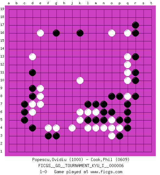 Last move : 1-0 2008 July 23 3:57:46 [Event "FICGS__GO__TOURNAMENT_KYU_I__000006 "] [Site "FICGS"] [Date "2008.04.24"] [Round "1"] [Black "Popescu,Ovidiu "] [White "Cook,Phil "] [Result "1-0"] [Rating 1 "1000"] [Rating 2 "0609"] 1.r16 e16 2.q4 g4 3.d4 d6 4.c5 o16 5.f3 f4 6.g3 j4 7.d8 e7 8.d11 d13 9.c6 d7 10.c7 o4 11.q6 q8 12.p3 o3 13.r13 q12 14.r10 q10 15.r8 q13 16.r11 q11 17.o6 p7 18.q7 p6 19.p5 o5 20.n6 m6 21.n5 p4 22.q5 m4 23.m5 l4 24.m7 l6 25.p8 o7 26.o8 k10 27.k16 q16 28.r17 e8 29.d9 e9 30.l5 k5 31.l7 k6 32.g16 n4 33.n7 1-0 This go game has been lost on time (started : 2008.04.24 19:48:31) Here are the names of the openings (joseki) played in the four corners : Corner d4 : g4 d4This joseki is unknown. A weak or weird move has probably been played in this corner. Corner q16 : r16 o16Komoku (Somok, Xiao~mu`) 3-4 Point. The komoku (3-4) point is the traditional corner enclosure move..Nikken Takagakari (Dukan Nop'dakeolch'im, E`r Gaojia, 2-Space High Approch). The great master Honinbo Shuei (1852-1906) favored the two-space high (niken taka-gakari) approach, especially in two stone handicap games. This approach move was very popular in the 1910s. Wu Qingyuan = Go Seigen frequently played this way, considering it a good "whole board" approach. In recent years, O Rissei has often used the two-space high approach. Corner d16 : e16 d11Takamoku (Gomok, Gaomu`) 5-4 Point. The takamoku (high) point (5-4). With its emphasis on influence, the 5-4 point complements the 4-4 (hoshi) point in creating an influence-oriented fuseki. Corner q4 : q4 o4Hoshi (Hwajeom, Seongjeom, Xingwei`) 4-4 Point. The star or hoshi (4-4) point, emphasizing influence at the potential expense of territory.Ikken Takagakari (Hankan Nop'dakeolch'im, Yi Gaojia, 1-Space High Approach). Black typically responds at 6-4 or 3-10. Black 4-10 is played when Black finds play on the right side advantageous. Black 4-8 or 3-8 may be played when Black has support at top. Player Black won this Go (weiqi, baduk) game.Follow this game move after move (download ) Grab the border points between two moyos. (Anonymous) The large trees attract high winds. (Chinese proverb)