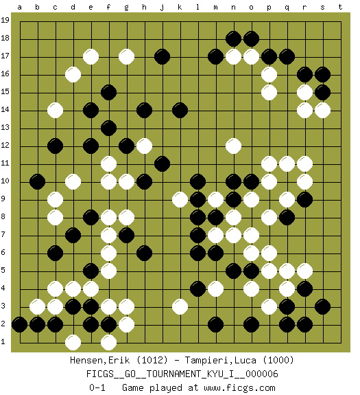 Last move : 0-1 2008 September 3 20:41:15 [Event "FICGS__GO__TOURNAMENT_KYU_I__000006"] [Site "FICGS"] [Date "2008.04.24"] [Round "1"] [Black "Hensen,Erik"] [White "Tampieri,Luca"] [Result "0-1"] [Rating 1 "1012"] [Rating 2 "1000"] 1.r16 d4 2.q3 d16 3.p17 q5 4.q8 r11 5.o8 r14 6.p4 r3 7.r2 q4 8.q2 p5 9.r4 r5 10.o5 o4 11.s3 p3 12.o2 m4 13.m2 o6 14.m8 d10 15.n5 n7 16.m6 m7 17.l7 p6 18.l6 n8 19.n9 m9 20.l4 g3 21.l8 o9 22.n10 p8 23.p9 o7 24.r9 p10 25.l10 p11 26.d3 c4 27.e3 e4 28.j17 g17 29.b2 c3 30.c2 f3 31.f2 g2 32.e2 b3 33.m17 f10 34.c12 c14 35.d7 f6 36.e8 g8 37.c6 c8 38.e12 f11 39.b10 c9 40.f13 h12 41.f15 e17 42.h14 k9 43.l9 p15 44.s15 s14 45.q10 q11 46.o10 q9 47.h6 r10 48.e5 f5 49.g7 f7 50.h10 f8 51.k14 n12 52.j11 g10 53.g12 o17 54.o18 n17 55.n18 p16 56.q17 r15 57.s16 k3 58.e14 d1 59.a2 f1 0-1 This go game has been lost on time (started : 2008.04.24 19:48:31) Here are the names of the openings (joseki) played in the four corners : Corner q4 : q3 q5 Komoku (Somok, Xiao~mu`) 3-4 Point. The komoku (3-4) point is the traditional corner enclosure move.. Ikken Takagakari (Hankan Nop'dakeolch'im, Yi Gaogua`jiao~, 1-Space High Approach). The 5-4 approach move has become more popular in modern times, as modern Go emphasizes speed and influence. Corner d16 : d16 j17 Hoshi (Hwajeom, Seongjeom, Xingwei`) 4-4 Point. The star or hoshi (4-4) point, emphasizing influence at the potential expense of territory. Player White won this Go (weiqi, baduk) game. Follow this game move after move (download)Corner, side, centre. (Anonymous) There will be no order, only chaos. (Sol Robeson in Pi by Darren Aronofsky)
